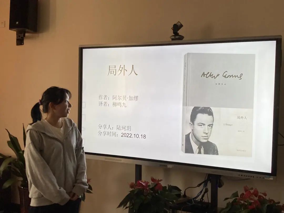 陆珂玥同学为大家推荐的是法国作家阿尔贝·加缪的中篇小说《局外人》。首先陆珂玥同学先叙述了自己选择这本书的原因,接下来描述了主人公莫尔索在荒谬的世界中经历的种种荒谬的事。她通过讲述莫尔索参加母亲的葬礼、其与玛丽的爱情故事以及法庭的审判这三个情节,给我们呈现出莫尔索这个行为惊世骇俗、言谈离经叛道的“局外人”形象。最后,陆珂玥同学指出,即使我们是那个“局外人”,我们也要热爱生命,享受快乐。