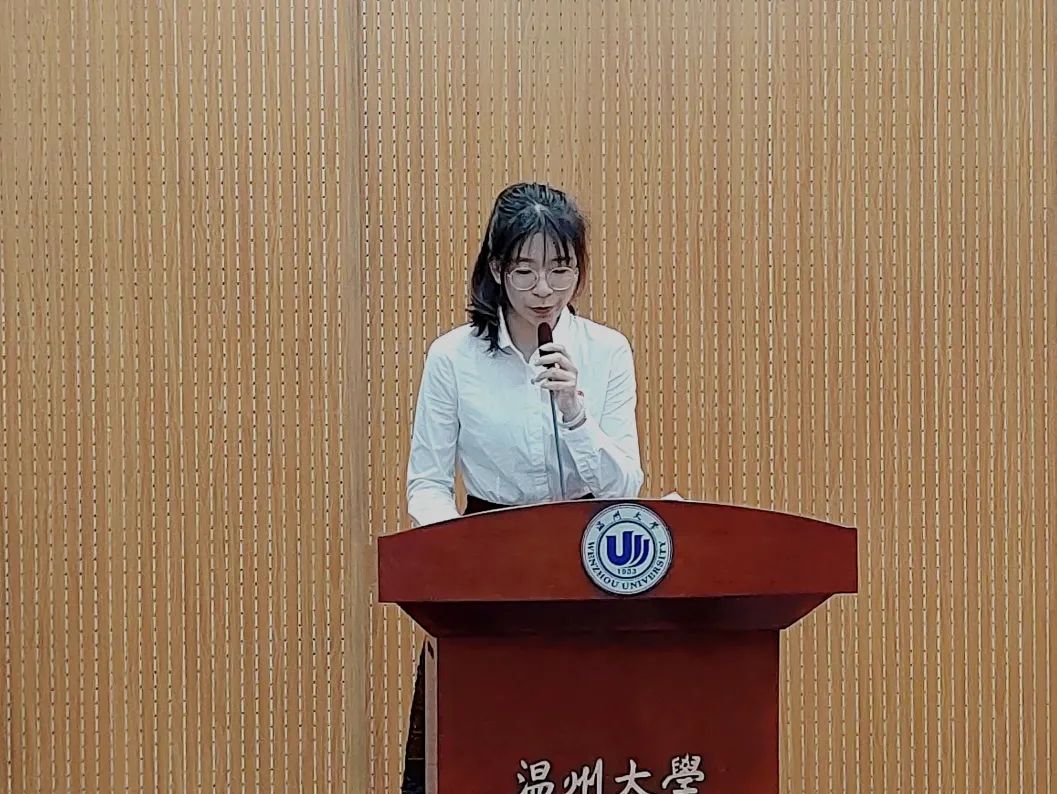 吴嘉沁同学宣讲的主题是《红色家乡——温州的破与立》。宣讲过程中,她如是说,“温州的破与立,向我们展现了新一代温州人将在困难中奋斗,在挫折中进取。相信在未来,新一代温州青年传承好红色基因,始终坚守初心使命,持续激扬新时代温州人精神,让红色精神绽放出更加绚丽的时代光芒”。