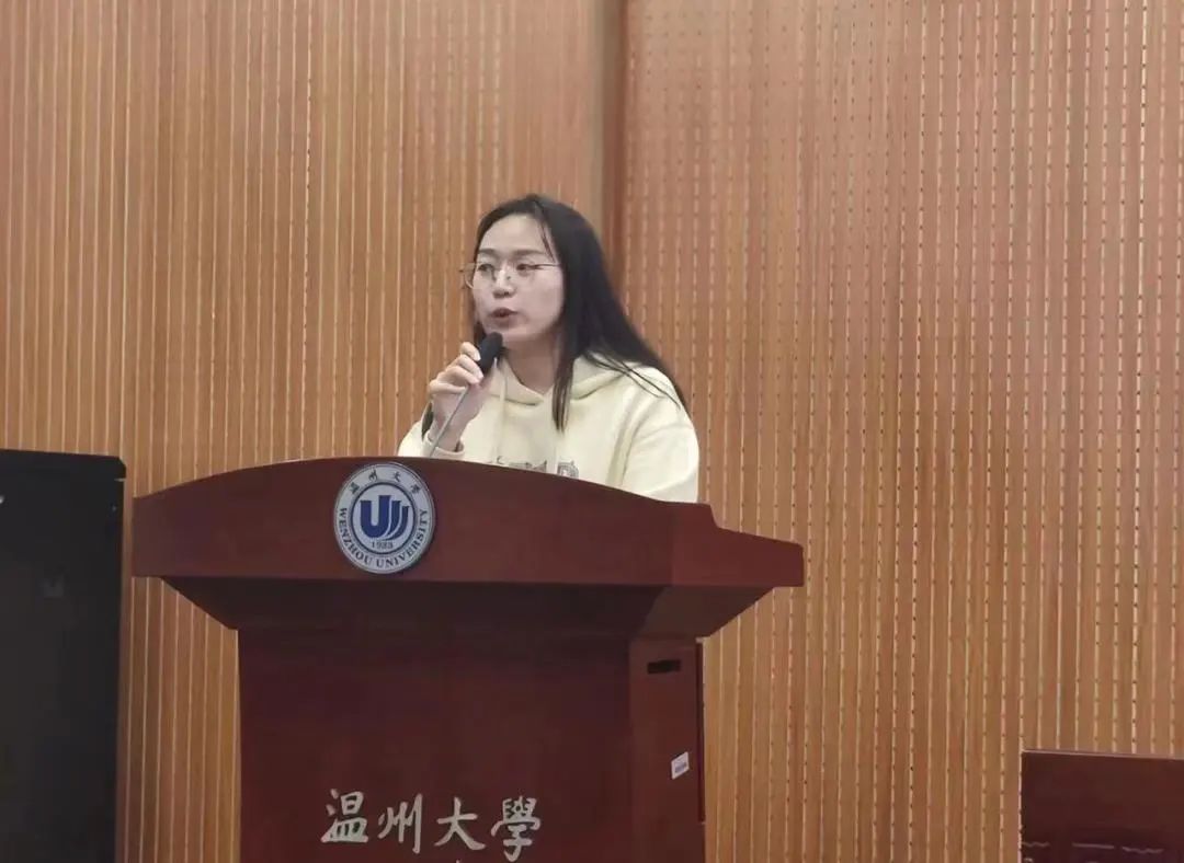 蔡雯雯同学的宣讲主题是《永不褪色的红色记忆——从温州人民广场出发》。她讲到,温州人民广场虽然已经被拆除,成为了温州人的旧记忆,但蕴藏在其中的红色记忆,依然锃亮。一代又一代的温州人,在瓯越大地上留下了深深的红色印记,让红色基因流淌进了温州人的精神血脉当中。温州的红色精神也指引和鼓舞温州人民在社会主义建设的前进道路上,不断战胜一个又一个困难,奋力夺取一个又一个胜利。