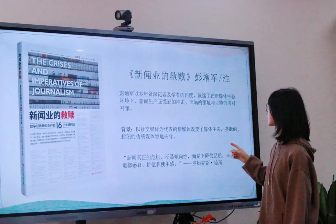会上,赵丹、王钟磊、蔡凌睿、黄昕、陈亚琴五位同学依次向老师和同学们分享了《机器新娘——工业人的民俗》、《交往在云端:数字时代的人际关系》、《乡土中国》、《新闻业的救赎》、《美丽新世界》等书籍。