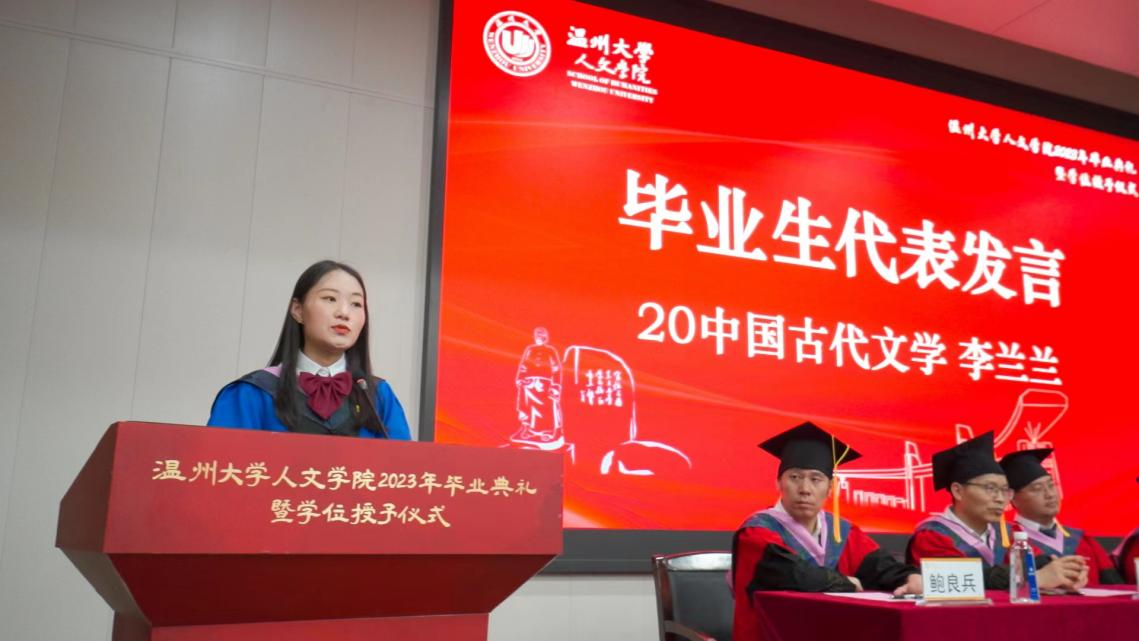 “要以路漫漫其修远兮,吾将上下而求索的恒心和决心,在祖国大地上书写属于温大人的华章。”研究生毕业生代表20中国古代文学李兰兰同学如是说道。本科生毕业生代表19历史学(师范) 李业同学则表示:“我们定将继续秉持温大人‘求学问是,敢为人先’的精神,力争上游,勇立潮头,在各自的领域发光发热。”