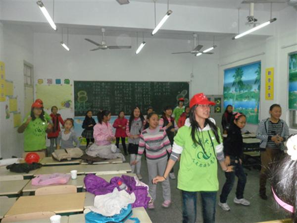 而在另一个歌舞班中,则是另一番景象,志愿者老师带给小朋友们的是一个以圣诞节为主题的教课内容。首先是由兴趣班老师简单的介绍了下关于圣诞节的一些内容,接着志愿者老师们教了小朋友们一首“we wish you a merryChristmas”以及一首“Jingle bells”歌曲,在一片歌声中结束了第一节课。在小朋友们短暂地休息了10分钟后开始了第二课,这节课上,志愿者老师为小朋友们准备的是一个跳舞的课程,小朋友们在下面学着领舞老师的样子,不一会儿举手投足之间都显得有模有样了。两个班级的活动持续到10点30分左右,兴趣班老师们把小朋友集合起来一起拍张合照,记录下了小朋友们在那一刻开心的笑脸。