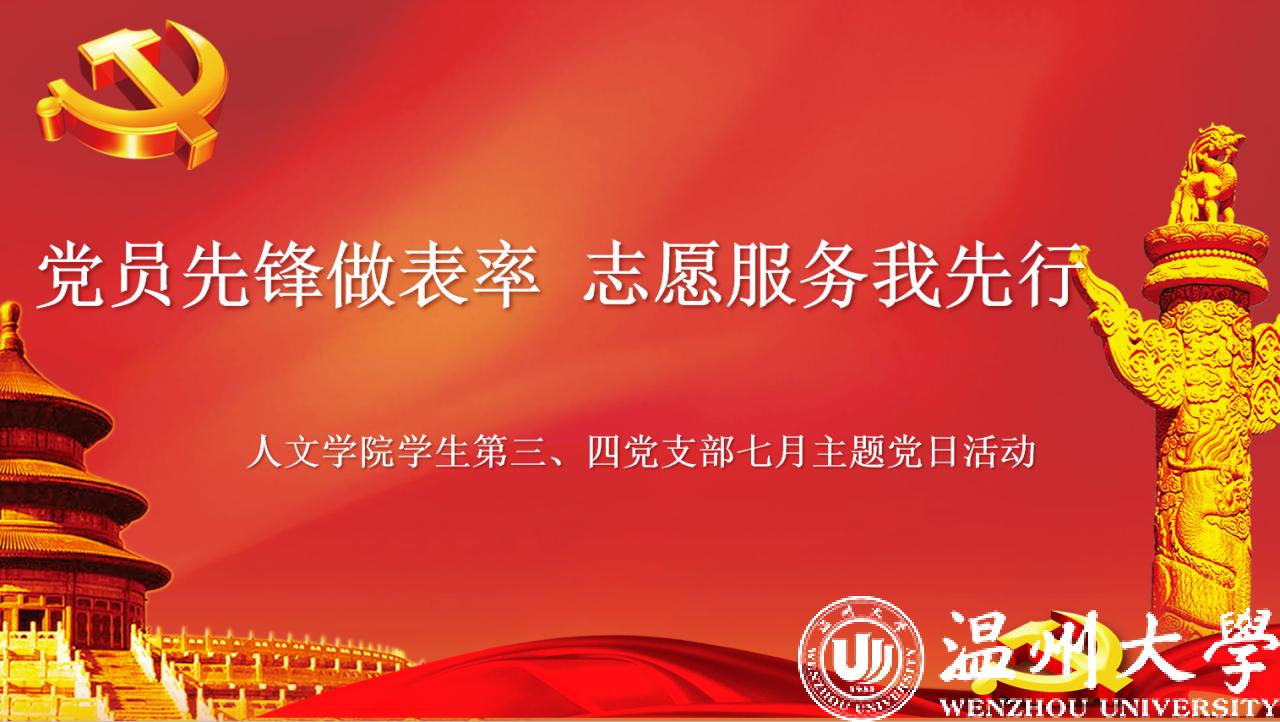 百年征程百年梦,喜迎华诞跟党走。在“红七月·服务月”来临之际,为深入学习贯彻习近平新时代中国特色社会主义思想和党的二十大精神,践行“学思想、当先锋、促践行、助共富”理念,温州大学球探体育 学生第三、四党支部以“带头讲党课”“带头解难题”“带头送关怀”“带头强作风”的“四带头”活动为引领,举办此次“党员先锋做表率 志愿服务我先行”的党日活动。