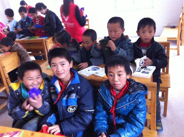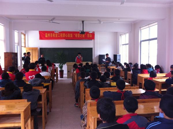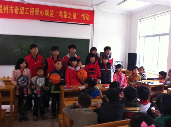 黄南乡中心小学作为一所希望工程小学,地理位置偏僻,交通极其不便。志愿者们前往小学共需要经历3次转车,耗时4小时才可以到达小学所在地,路途的颠簸坎坷所带来的辛劳更是无需多言。但是这一切都只能让志愿者们更加好奇这将是一所怎样的小学,学校的学生又该是怎样在那里学习的,他们生活学习条件的艰苦也从中可见。带着关切的心情,志愿者们终于来到了黄南乡中心小学。学校的小朋友们对志愿者们的到来表现出非常大的热情,纷纷邀请志愿者们一起参加游戏、打球。在游戏进行的间隙中,甚至有一个志愿者很是热心地帮孩子们扎起了辫子,孩子稚嫩的脸庞上满是神采奕奕的微笑。在简单地参观了学校之后,所有志愿者们都参加了物资捐赠仪式,即“希望之星”开始仪式。活动中,志愿者们为孩子发放了书本、御寒手套、体育用品,同时教孩子们学习歌曲《爱,因为在心中》。活动气氛活跃,孩子们的热情很高。