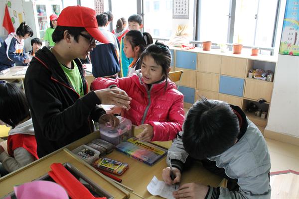 8点钟,志愿者们到达了温州特殊教育学校的门口。我们带着尊重和关爱走进学校。进了教室便可以看见孩子们坐在那里,很安静的笑着。经过半小时的电影《狗的生活》观赏之后,活动正式开始。每三个志愿者带着四个小朋友,一起为新送来的书籍包书皮。小朋友心灵手巧个个一学就会,不一会儿,便完工了。