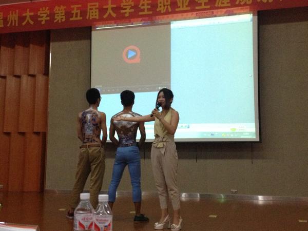 的丁明月同学以作品《fly》,做一名人体彩绘师,参加职业规划类比赛。在观众热烈的掌声中,她以对职业探索、自我探索的深刻分析,对成长之路的准确规划,对大赛主题的完美陈述,对评委提问的灵活应变,大方得体的仪表,流畅精炼的谈吐等优点赢得了评委和在场观众的好评,最终以总评并列第二名,职业类第一名的成绩获得了"十佳职业规划之星"的荣誉。