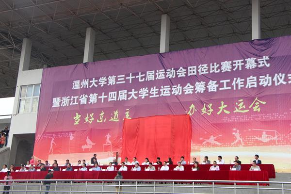 20141029830分,温州大学第三十七届运动会田径比赛开幕式暨浙江省第十四届大学生运动会筹备工作启动仪式在温州大学南校区操场举行。温州大学校领导陈福生、蔡袁强、赵敏、吴金法、蔡曙光、陈安金、方益权、潘玉驹以及有关部门负责人、各学院负责人出席了开幕式。开幕式由副校长薛伟主持。