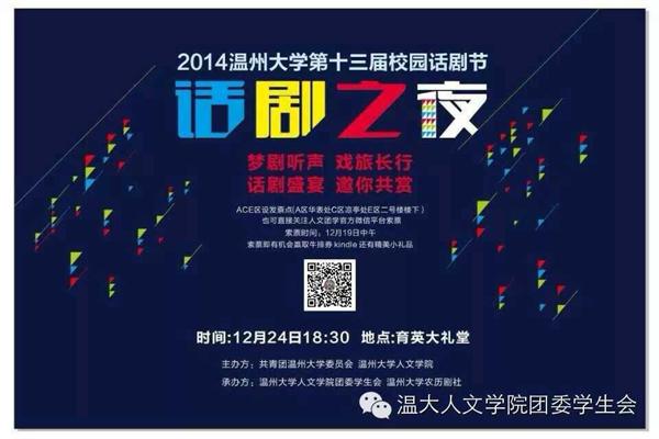 2014年12月24日18:30,"梦剧听声,戏旅长行"温州大学第十三届校园话剧节话剧之夜在育英大礼堂正式开演。此次活动由共青团温州大学委员会、温州大学球探体育 主办,温州大学球探体育 团委学生会和温州大学农历剧社承办。院党总支书记吴静,院副院长孙良好,校团委陈莹老师等和到场的同学们共同享受了一场视听盛宴。