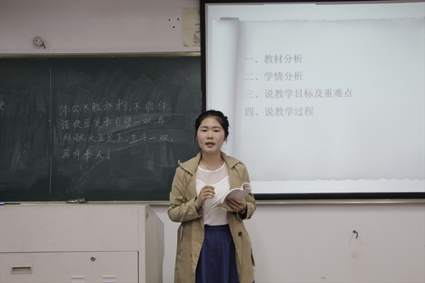 本次比赛共吸引了全校116名来自不同学院、不同专业的选手参与,与去年相比,参赛人数大大增加。在中午短暂的比赛介绍和抽签之后,下午4点整,本次比赛正式开始。此次比赛共分为两个环节,第一环节是板书,选手随机抽取板书内容上台在黑板上书写,有的干净潇洒,有的清新俊逸,一笔一划间尽显未来教师的风采。第二环节是三分钟说课,选手们根据自身情况选择合适的课题进行说课,说课内容丰富多彩,涵盖了语文、数学、英语、化学、历史、计算机等多门学科,选手们从教学内容、教学思路、教学方法等多方面对课题内容作了讲述,或声音高亢、或神采奕奕,举手投足间无不展现出初为人师的风采。