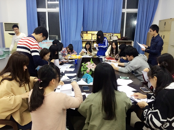 讲解结束后,干事们便开始了工作。大家对活动所要用到的题目进行了整理,并把题目固定在活动锦旗上。虽然工作量很大,但干事们分工明确,工作进行得有条不紊,最终高效地完成了。虽然晚上突然下起倾盆大雨,天气条件非常恶劣,但是人文团学的学生干部们仍然准时准点地赶到了工作场地开展工作,他们对工作的热忱及责任感让人为之喝彩。