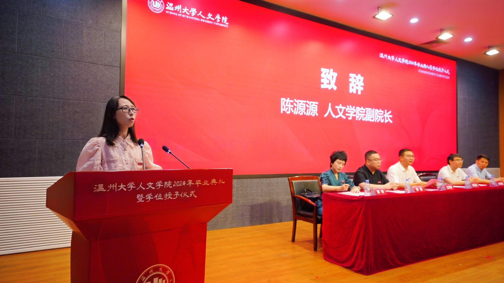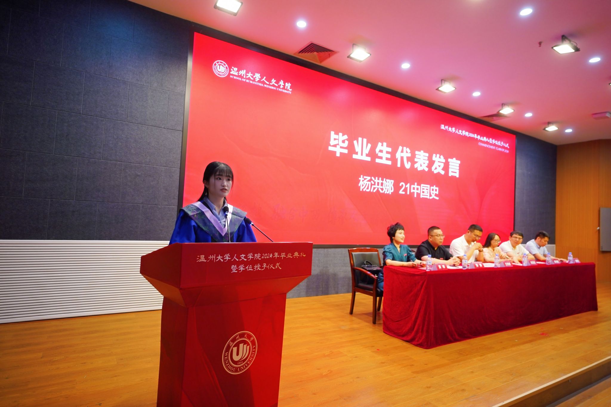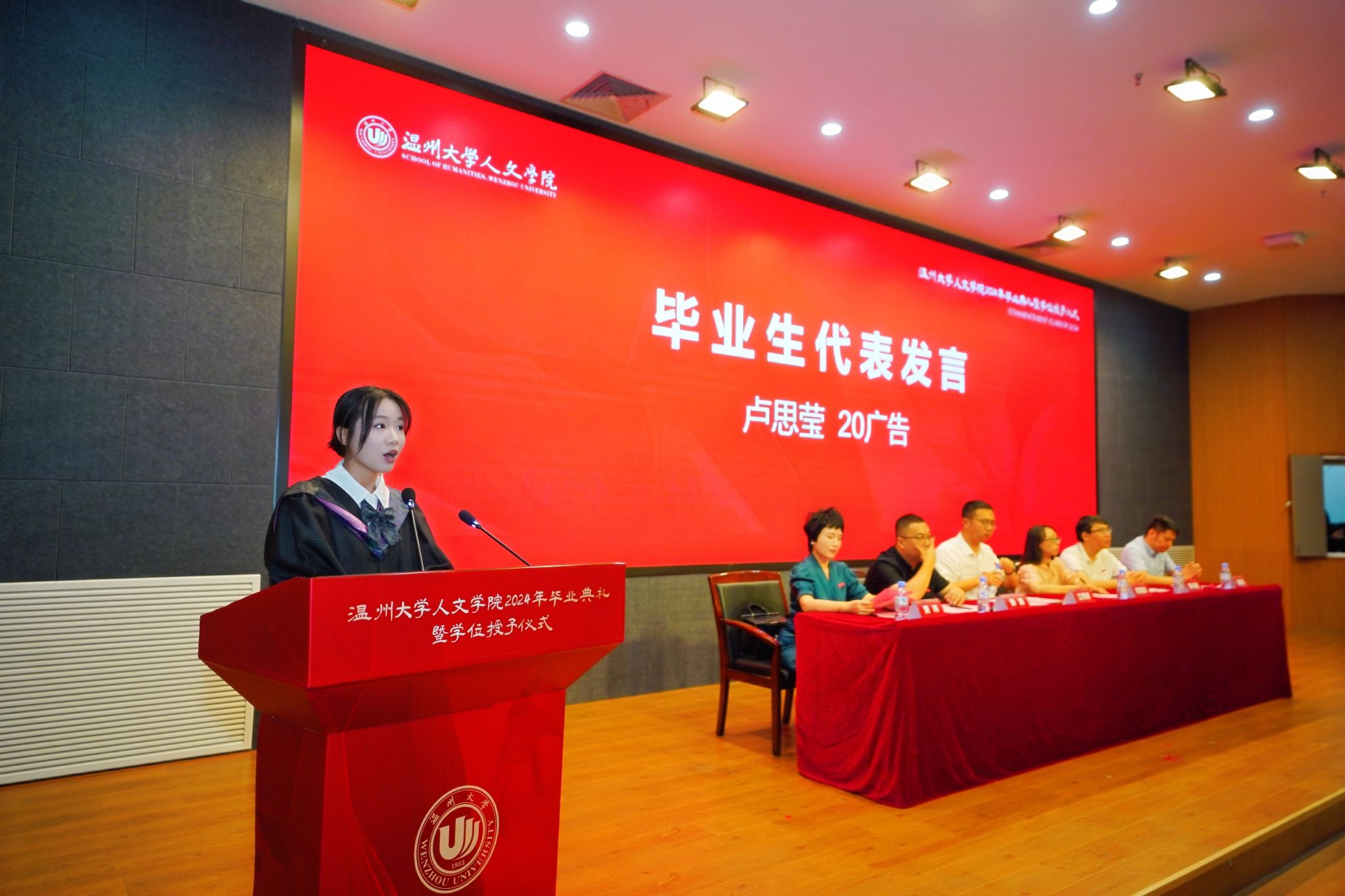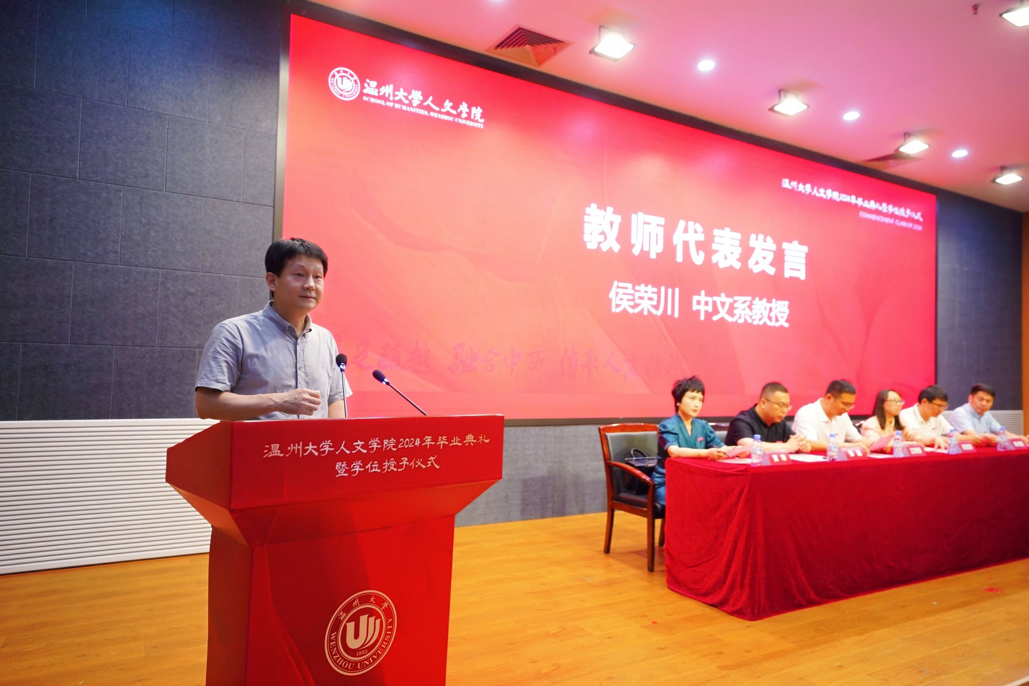 温州大学古籍整理研究所所长、中文系教授侯荣川老师作为教师代表发言。他指出,毕业只是一个人生阶段的结束,而不是学习的终结,强调了人文学子们要有终身学习的坚定信念。同时他还结合自己的亲身经历叮嘱毕业生们:人生并不是一帆风顺的,希望同学们要提前做好失意、失败,甚至是撞得头破血流的准备。他还希望同学们要学会做一个真诚努力,懂得合作共赢的人,学不会合作的人注定是失败的人。除此之外,人生是旷野,不是轨道,不存在将我们从这一站运往下一站的列车,需要我们独自勇敢地去面对崇山峻岭,因此他还希望同学们能够努力突破困难,去书写即使微小但独属于我们自己的人生。