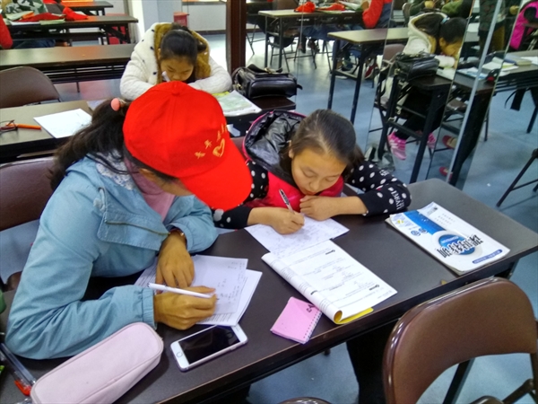 下午12点40分,志愿者们准时集合在我校南校南大门,在南校大门集合后,登上了前往鹿城区南汇街道龙港社区养老服务中心的巴士。下午1点20分左右,志愿者们来到了养老服务中心,一到达便对现场进行了桌椅布置,之后便等待着小朋友的到来。下午1点40分左右小朋友们抵达了活动现场,负责人对志愿者进行分配,让志愿者一对一甚至多对一的辅导小朋友,志愿者们在与小朋友们熟悉之后,志愿者们进入状态,便认真开始为孩子们讲解题目,孩子们在志愿者们的悉心教导下也十分投入,从陌生渐渐熟悉放松,不断地提出新的问题。在交流与沟通中气氛渐渐升温,尽管在寒冷的冬季雨天中,室内的气氛却十分温暖而温馨。为了保证孩子们不会太过劳累,志愿者们在孩子们学习了40分钟后便与孩子们开始了有趣的课间时光,有志愿者与孩子们谈天说地,也有志愿者拿出折纸教导孩子们折千纸鹤,甚至有小朋友自己带了飞行棋想与志愿者一起较量。而在休息之后孩子们又开始专注的投入到学习之中,时间便在学习中飞快的度过,志愿者们在4点30分与小朋友们合影后,收拾场地便十分不舍地告别了。