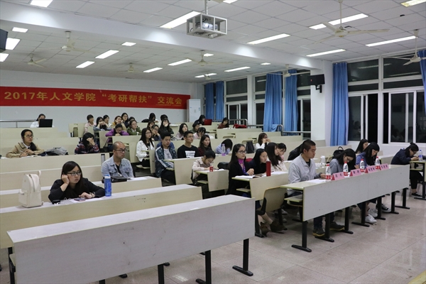 于人文楼202教室举行了考研交流帮扶会。研究生高分代表李丹萍、林望帆、徐珍、张杭,及数位本科生参加了本次帮扶会。