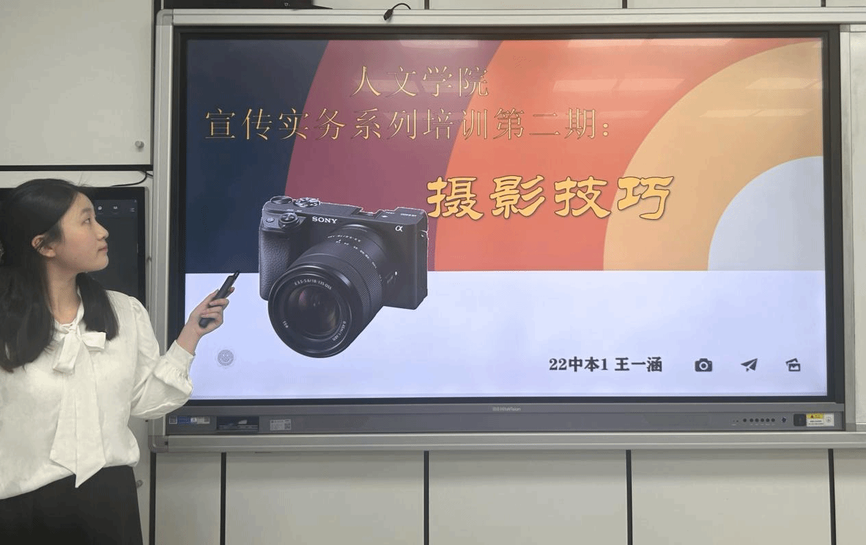 为了进一步提升球探体育 宣传工作的质量与影响力,10月23日晚18:30,球探体育 在人文楼409智慧教室组织了第二期宣传系列培训,对学院各宣传部门学生干部进行摄影技巧培训。本次培训由球探体育 22中文(师范)1班王一涵主讲。
