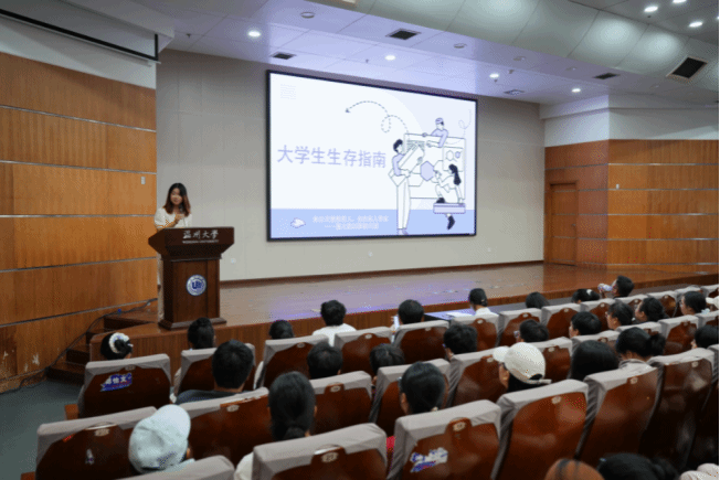 随后,由班助代表蒋麦莎发言。蒋麦莎学姐结合自身成长经历,从同学们最关注的“衣、食、住、行”“学、奖、考、禁”八个方面入手,娓娓道来,分享了宝贵而实用的经验。在聆听了食堂膳食、各类证书、学风建设、奖学金制度等事项的系统性讲解之后,初入校园的小萌新们增强了对未来大学生活的信心与期待,看到了前进的方向。