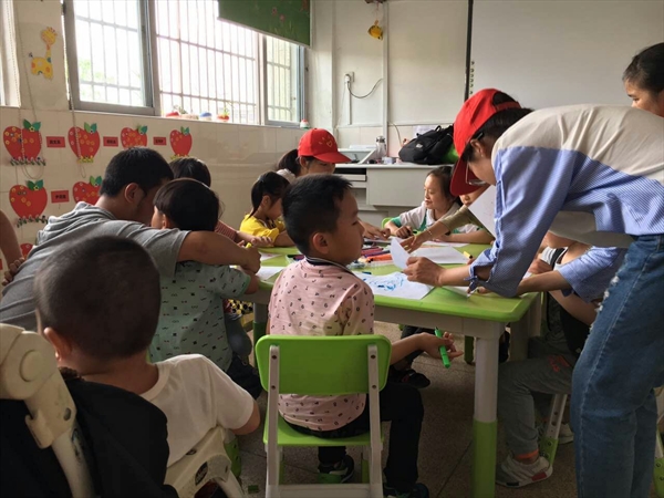 下午1点在高教园区始发站志愿者们集合,乘坐公交前往活动地点,在1点半左右的时候到达瓯海利宝特殊学校。在教室中等待孩子们的进入,在孩子们集合完成之后分成两队进入到不同的教室,一个教室内志愿者们拿出折纸和孩子们一起开始按照之前所找出的资料中的方式教授孩子们折纸,虽然孩子们在最初的时候对志愿者有些冷淡,但是在志愿者的耐心教导下,渐渐开始动手将面前的纸照着样子开始折起来。虽然有些孩子仍旧照着自己的意愿折纸,但是却能够将自己的折纸在志愿者的帮助下不断的完善自己的作品。千纸鹤,纸爱心,纸玫瑰等各种纸质作品在孩子们,志愿者们手中产生。孩子们在自己做好的作品之上写上自己的名字。在制作完折纸后,学校的老师让孩子们在课间进行休息,在10分钟的课后时间过去后,志愿者整理完折纸所产生的垃圾,并将接下来画画所需要的纸和彩笔分配给孩子们,并把实现画好的图形步骤展示给孩子们看,志愿者握着孩子们的手一起描摹纸上的动画图形,在生疏的画笔慢慢熟悉了线条之后,志愿者放手让孩子们随着自己的意愿进行绘画,并在孩子们画得有些不流畅的地方进行修改。孩子们在不长的时间里完成了自己的绘画,并开心的将自己的画作展示给教他们画画的志愿者们。在4点志愿者和孩子们完成了教室的整理与孩子们完成合影。