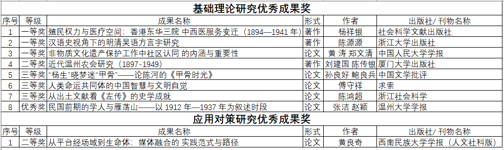 温州市第十七届哲学社会科学优秀成果评审结果现已公布,球探体育 荣获八项基础理论研究优秀成果奖、一项应用对策研究优秀成果奖。