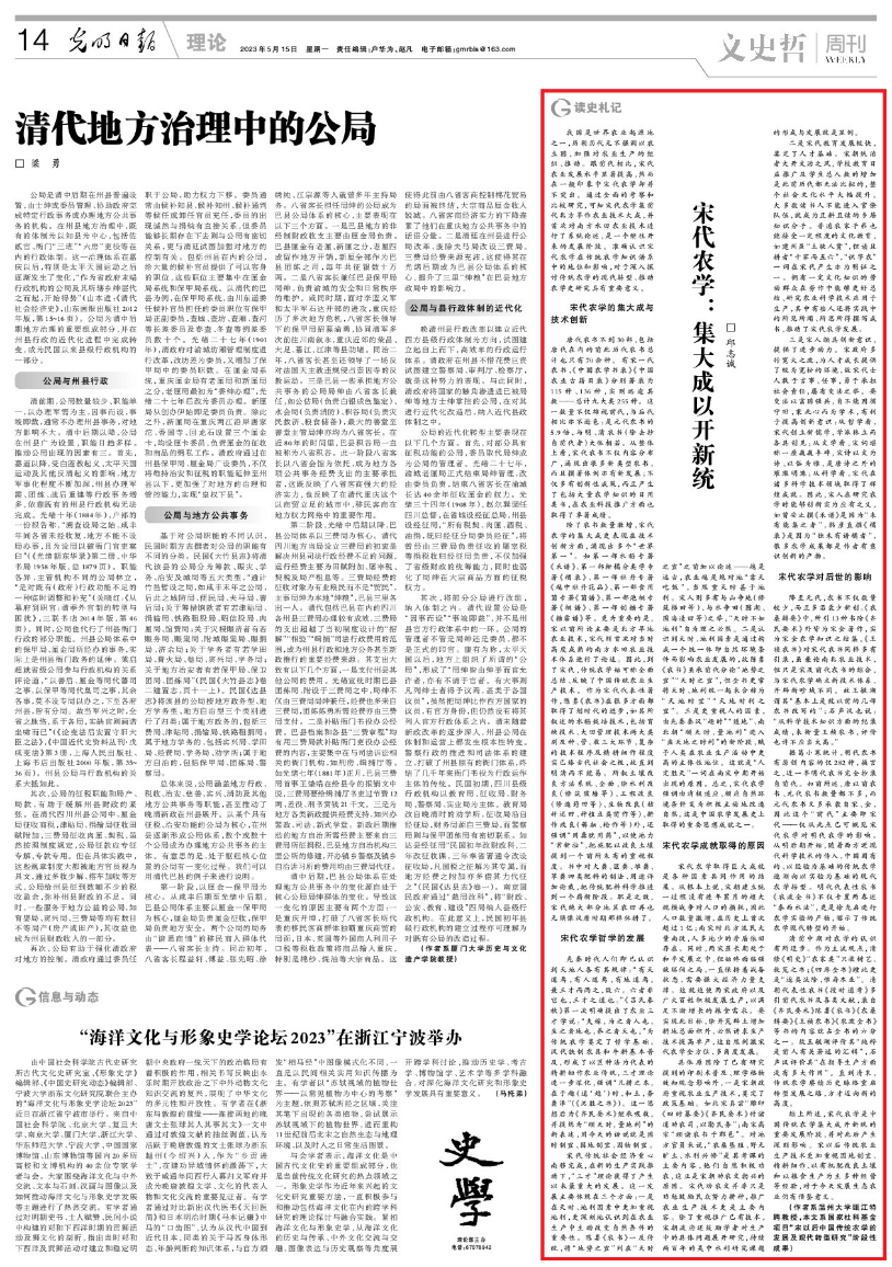 日前,《光明日报》(2023年5月15日)刊发我院邱志诚教授的理论文章《宋代农学:集大成以开新统》。该文为国家社会科学基金项目“宋以后中国传统农学的发展及现代转型研究”的阶段性成果。