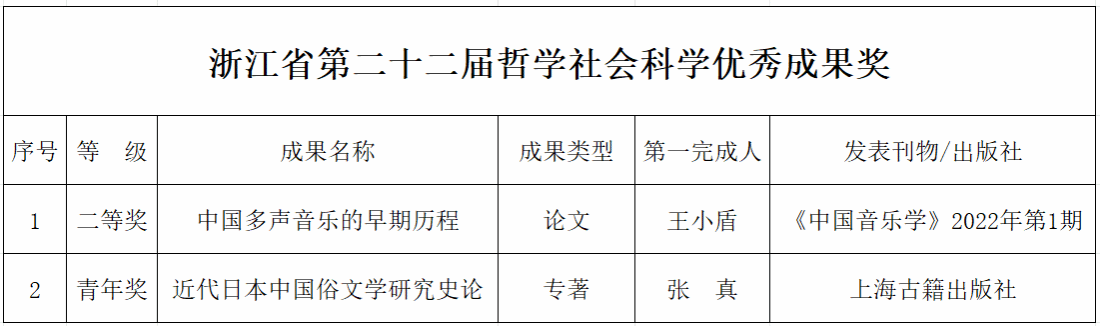 近日,浙江省第二十二届哲学社会科学优秀成果奖获奖名单揭晓,球探体育 王小盾教授的论文《中国多声音乐的早期历程》获批基础理论研究优秀成果二等奖,张真副教授的著作《近代日本中国俗文学研究史论》获批基础理论研究优秀成果青年奖。