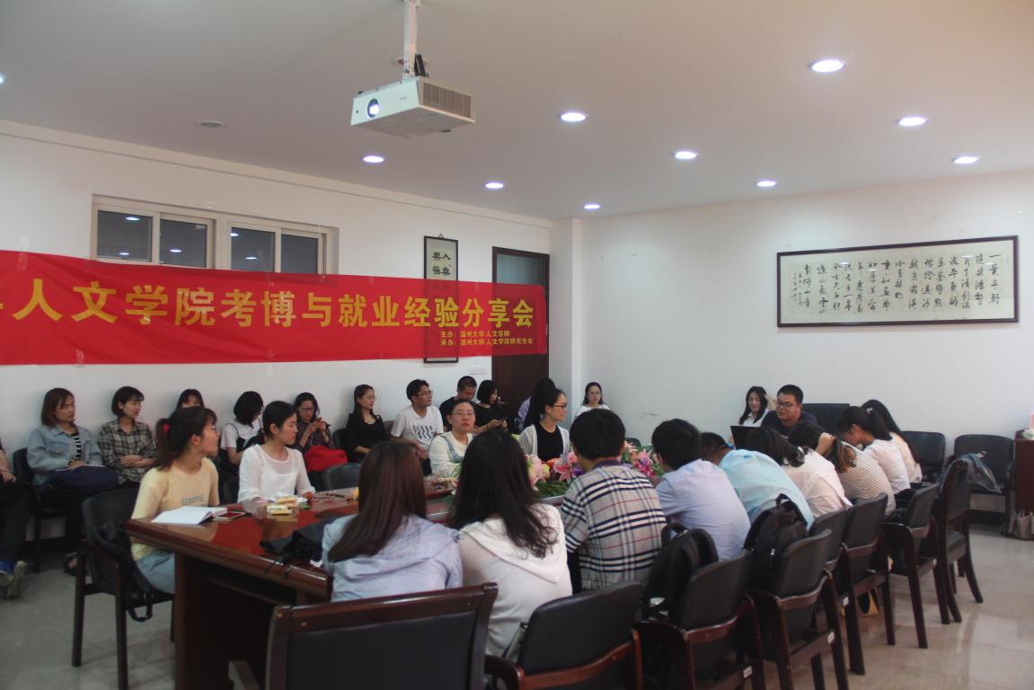 6月6日下午,球探体育 在一号楼213会议室举办了考博与就业经验分享会,本次分享会有幸邀请到七位考博成功以及拥有丰富就业经验的2015级研究生,就大家所热切关注的考博及就业相关问题进行交流和解答,球探体育 部分研究生参与了此次交流会。