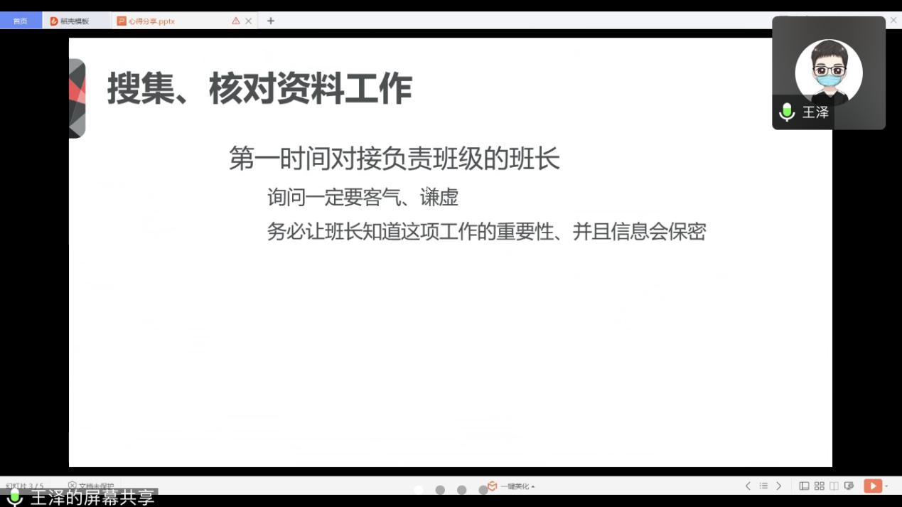 王泽同学将调查工作总结为前期信息核对收集和后期督促填写调查问卷两个部分。对于前期的工作,他建议大家第一时间与对接班级的班长联系,并向班长说明这项工作的重要性和保密性,以便后期工作的有序开展。在调查后期,对于尚未填写调查问卷的同学,可以采用班长统一催促、自己一对一联系等方式,协助就业调查的顺利完成。叶海强同学分析了影响就业调查工作效率的各个因素。他建议在调查过程中重视班长起到的信息传达作用,保持良好的沟通态度并在后期积极跟进。董丽霞同学则向大家详细介绍了问卷答题操作中会遇到的问题以及相应的解决办法。