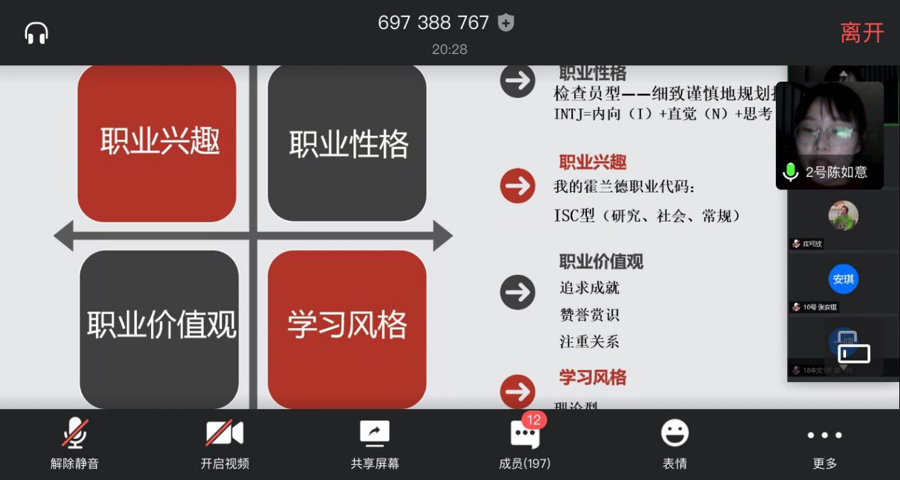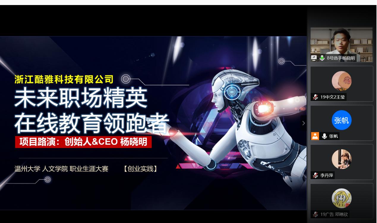 2020年5月15日18:30,球探体育 在腾讯会议上举行了第六届职业生涯规划大赛决赛。东方学院就业指导教研室主任叶加德老师、浙江工贸职业技术学院就业教师高富春老师、温大招生与就业处生涯教育科科长洪艳老师、温大招生与就业处就业指导教研室主任朱丽莉老师和院学工办主任刘纪峰老师作为评委到场。