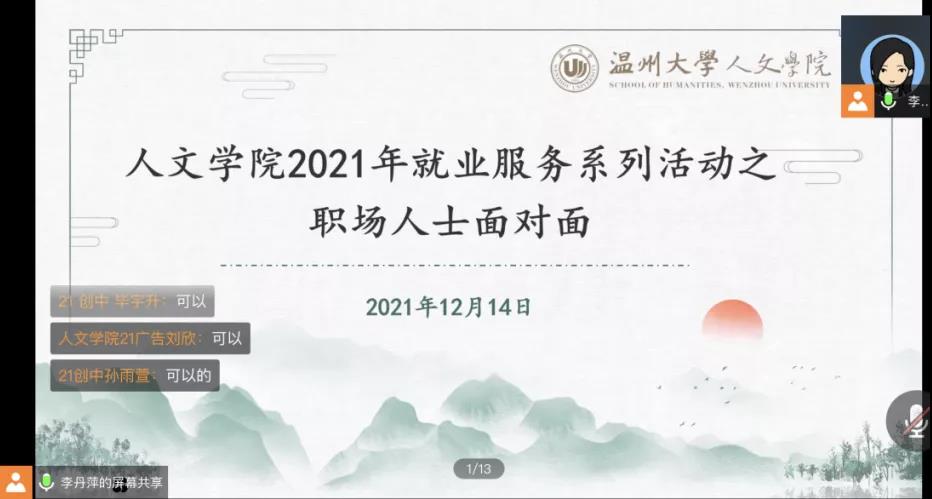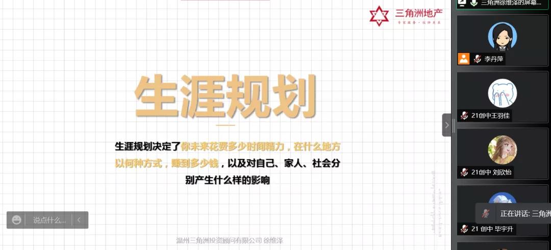 为明确同学们的职业规划方向和职业发展成长路径,2021年12月14日下午,球探体育 邀请温州三角洲投资顾问有限公司人力资源经理徐维泽和策划经理张舒乐,在腾讯会议上为大家分享职业规划和职场上的那些事儿。