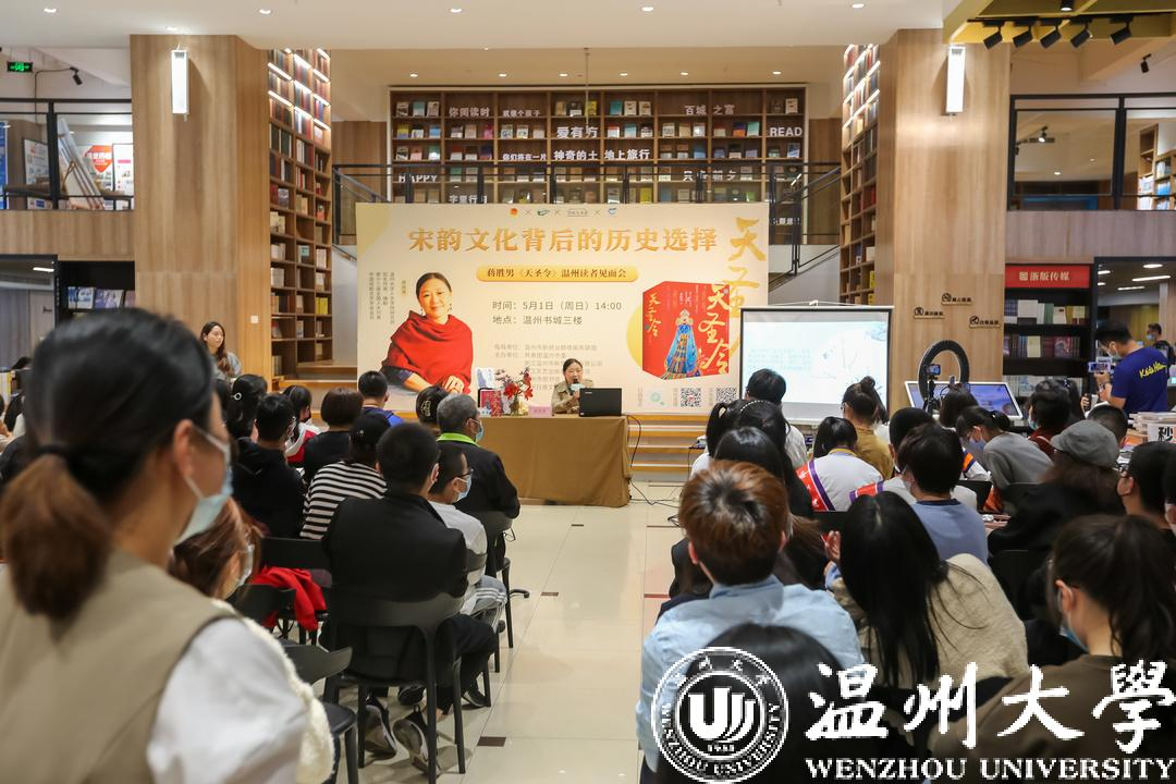5月1日下午,在温州书城“浙版大讲堂”的现场,女性大历史小说的优秀代表蒋胜男以新作长篇历史小说《天圣令》为例,为温州读者带去了一场宋韵与瓯风相融合的讲座,分享了自己作品中的宋韵文化元素及其背后的历史选择,探讨宋韵文化的品牌价值。据悉,本次活动由温州市新就业群体服务联盟的指导,共青团温州市委、浙江温州市新华书店有限公司、浙江文艺出版社有限公司主办,温州市图书馆、温州日报文化中心协办。