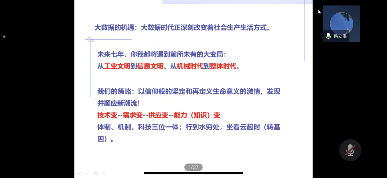温州大学校纪委副书记、监察室主任杨立淮老师主讲。杨老师从宏观与微观的角度讲述了当下大数据时代正遇到的变局,自工业文明到信息文明,自机械时代到整体时代下怎样顺应潮流并提升媒介素养。杨老师提醒大家应建立整体化的视野,更加注重互联网下的价值,才能更好地抓住大数据的机遇,让互联网为我所用,而不是沦为网络的“奴隶”。