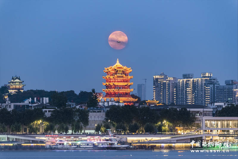 武汉黄鹤楼上空悬挂着一轮超级满月