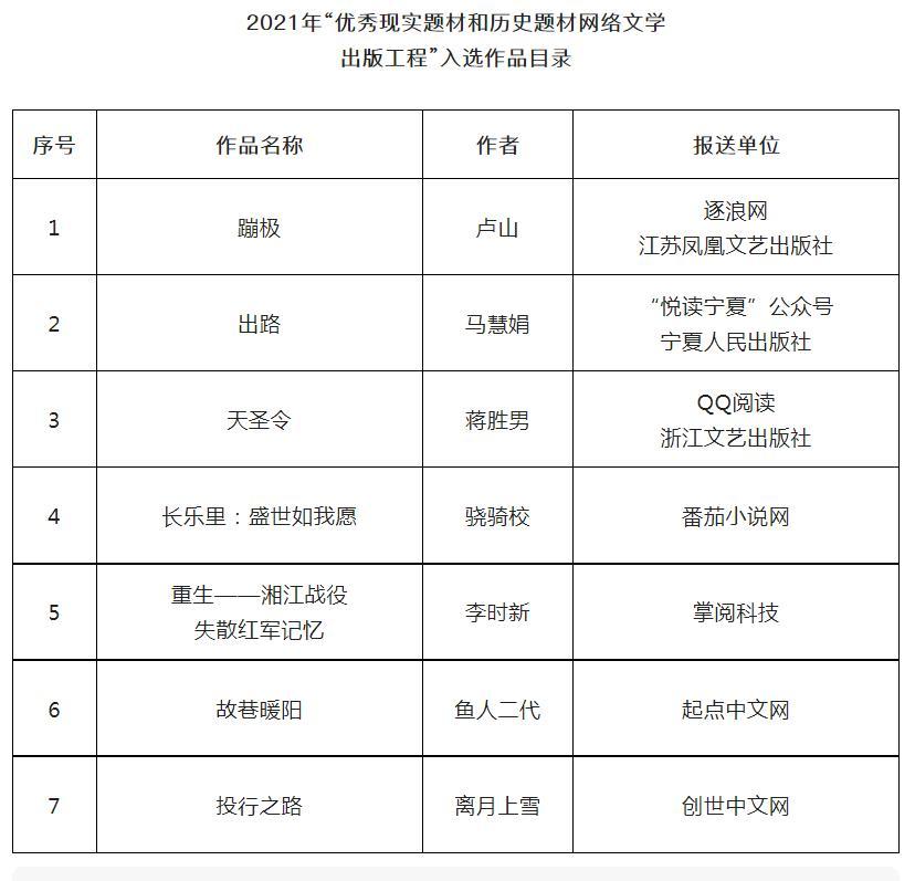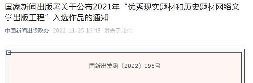 近日,国家新闻出版署发布关于公布2021年“优秀现实题材和历史题材网络文学出版工程”入选作品的通知。
