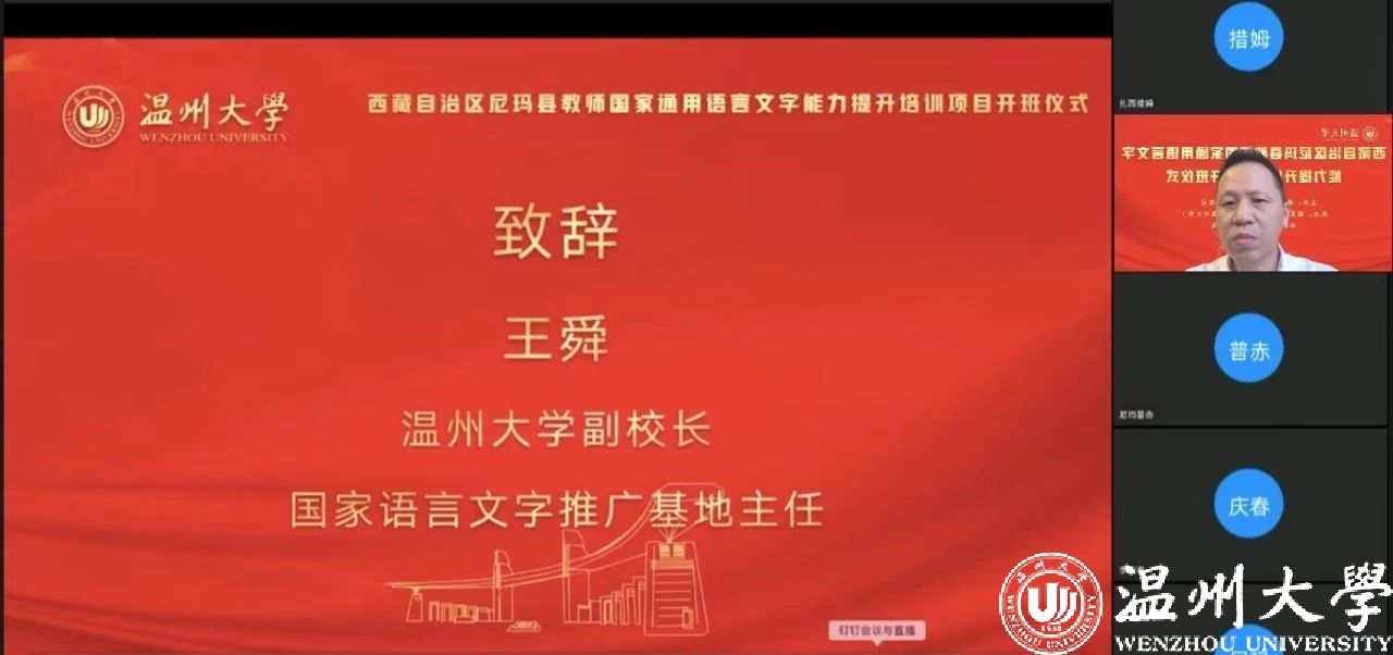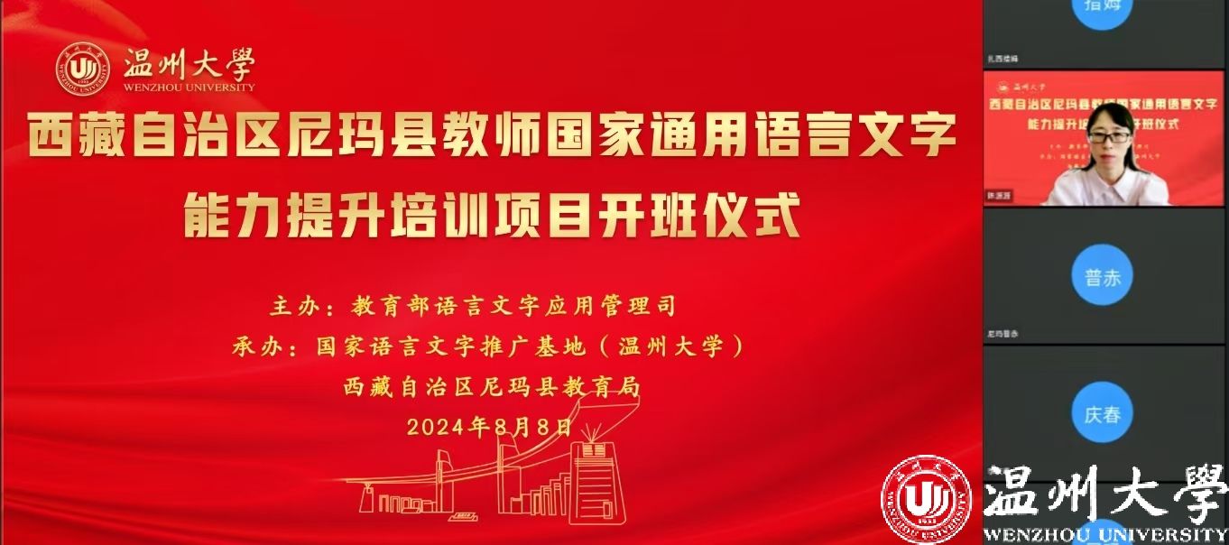 中国教育在线浙江站讯 (编辑 陈显婷 通讯员 温大萱)8月8日上午,由语言文字应用管理司主办,国家语言文字推广基地(温州大学)、西藏自治区尼玛县教育局联合承办的“2024年西藏自治区尼玛县教师国家通用语言文字能力提升培训班”举行了线上开班仪式,国家语言文字推广基地(温州大学)执行主任陈源源教授主持仪式。