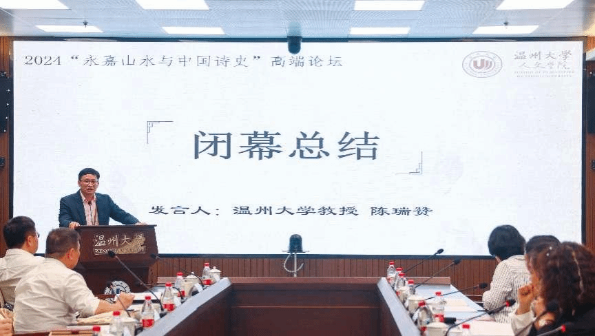 经过一天紧张而充实的学术交流,研讨会于16日下午圆满结束,温州大学教授陈瑞赞进行闭幕总结。温州大学中国山水诗研究中心自2021年底成立以来,每年都邀请专家学者举行一次学术研讨会。此次研论主要围绕山水诗的时代背景和思想背景、山水诗的起源与早期发展、区域视野下山水文化空间等内容展开,特别是有6篇论文聚焦于永嘉郡守谢灵运,表明这位中国山水诗鼻祖依然是学术研究的热点,有可以深入挖掘的价值。“谢灵运离开温州已经1600年。这次研讨会,是遥望谢灵运远去的背影,以山水诗的名义,向这位中国诗史上的伟大人物发出的致敬。”