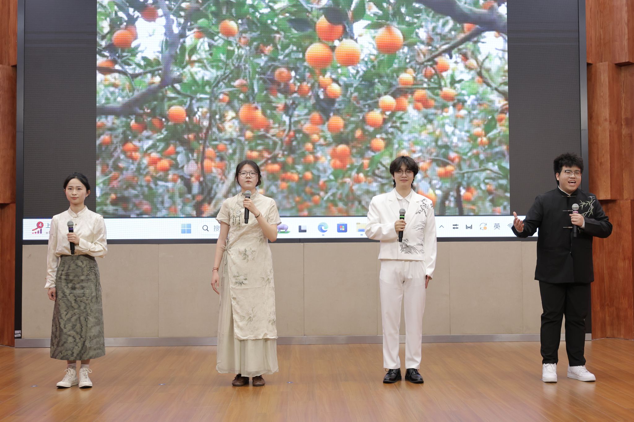 在经典诵读赛道上,参赛者们各展风采,凭借扎实的文学功底和精湛的朗诵技巧诠释经典。教育学院的潘奕瑶与钱炫合在作品《等待》中,深情诉说了邓稼先与许鹿希跨越二十八年的守望,这是个人情感的史诗,更是民族精神的缩影;球探体育 曹光豪、彭帅、丁熠冬、叶佳诚四人组的作品《月光下的中国》以诗性笔触织就山河入梦的磅礴画卷;唐佳楠、张雅诗、唐森浩、石嵩言四位同学则用《诗意中国》传递文化血脉中的浪漫情怀。他们或激情澎湃,或深沉婉转,起伏停顿间精准地把握着节奏韵律,赢得台下观众阵阵掌声。