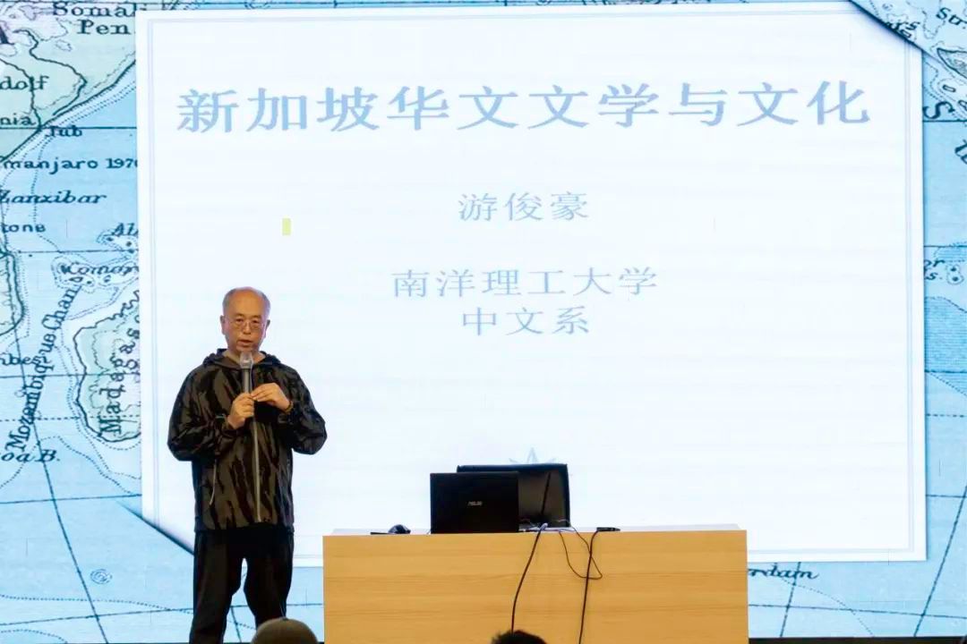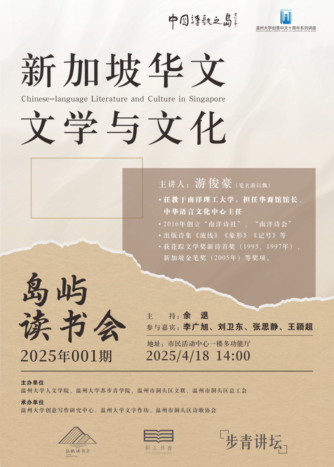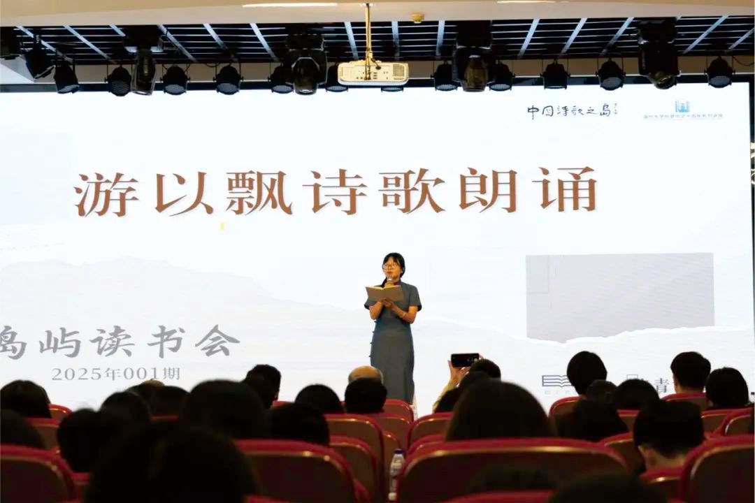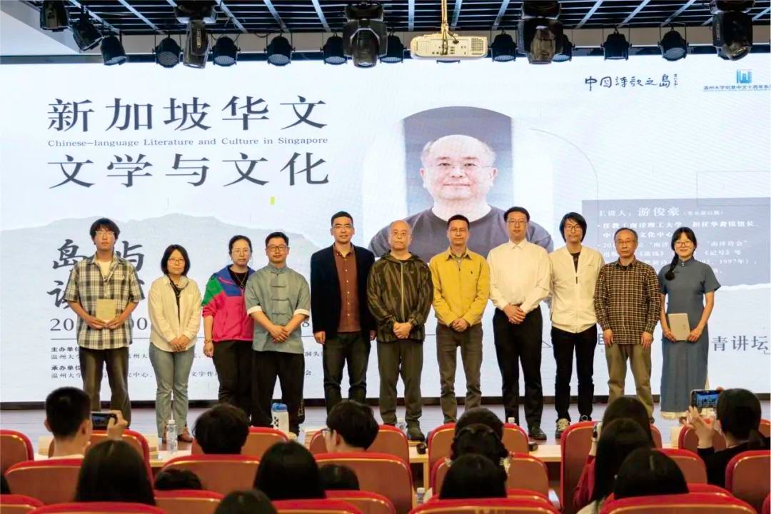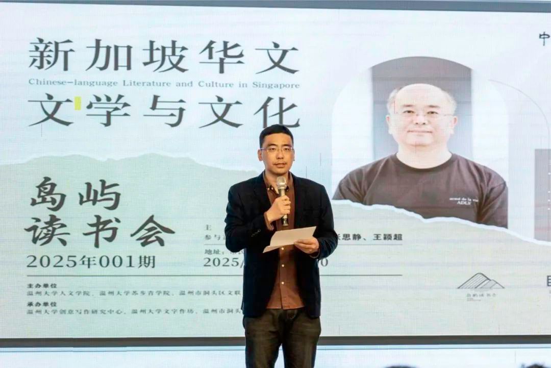 新加坡南洋理工大学游俊豪教授作为主讲嘉宾,系统讲解了新加坡华文文学的百年发展脉络,带领读者感受新加坡华文文学作品独特的魅力与历史。这位集学者与诗人于一身的文化使者,不仅担任南洋理工大学华裔馆馆长、中华语言文化中心主任,更以《流线》《象形》《记号》等诗集蜚声文坛。活动现场,洞头区文联主席林慷慨特别授予游俊豪“文艺岛民”荣誉身份,温州大学学子声情并茂地演绎了游教授的诗作,带领听众穿梭于跨文化的诗意空间。