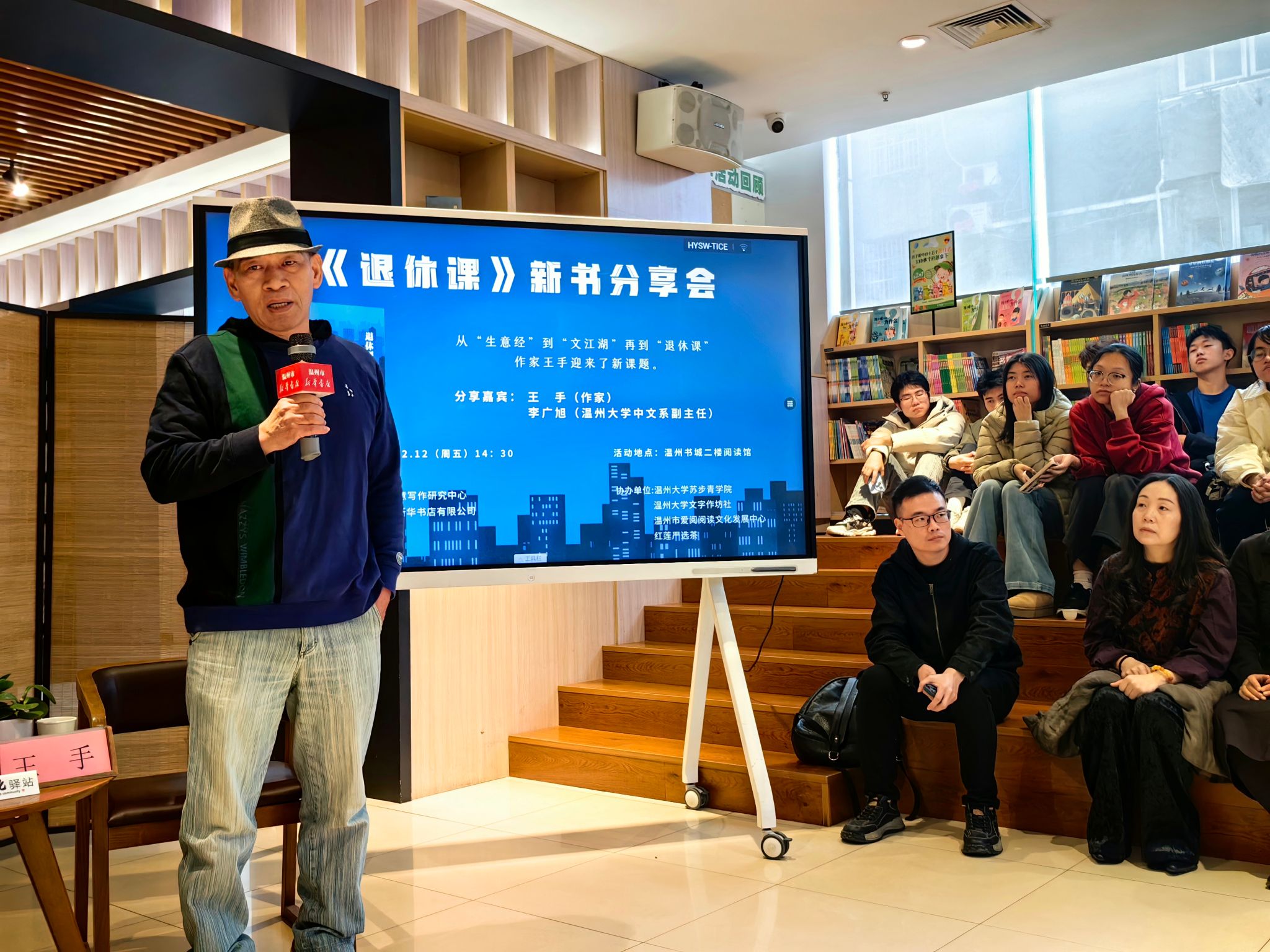 “厚植农情、浸润书香”,12月12日,由温州大学创意写作研究中心、浙江温州市新华书店有限公司主办,温州市爱阅阅读文化发展中心、红莲严选茶协办的新华大讲堂活动在温州书城二楼文化驿站举行。本次活动聚焦温州本土作家王手新著《退休课》,以文学分享为纽带,串联起城市记忆与生活哲思。