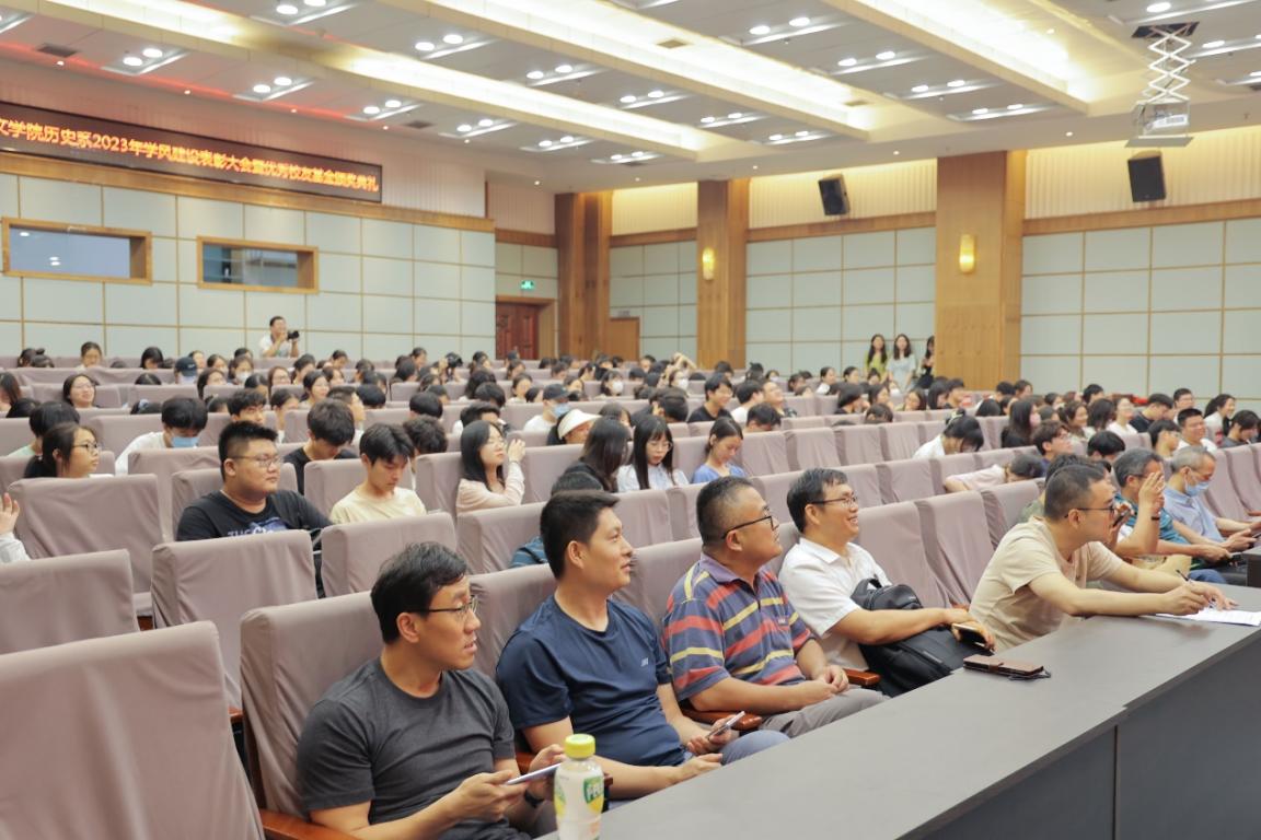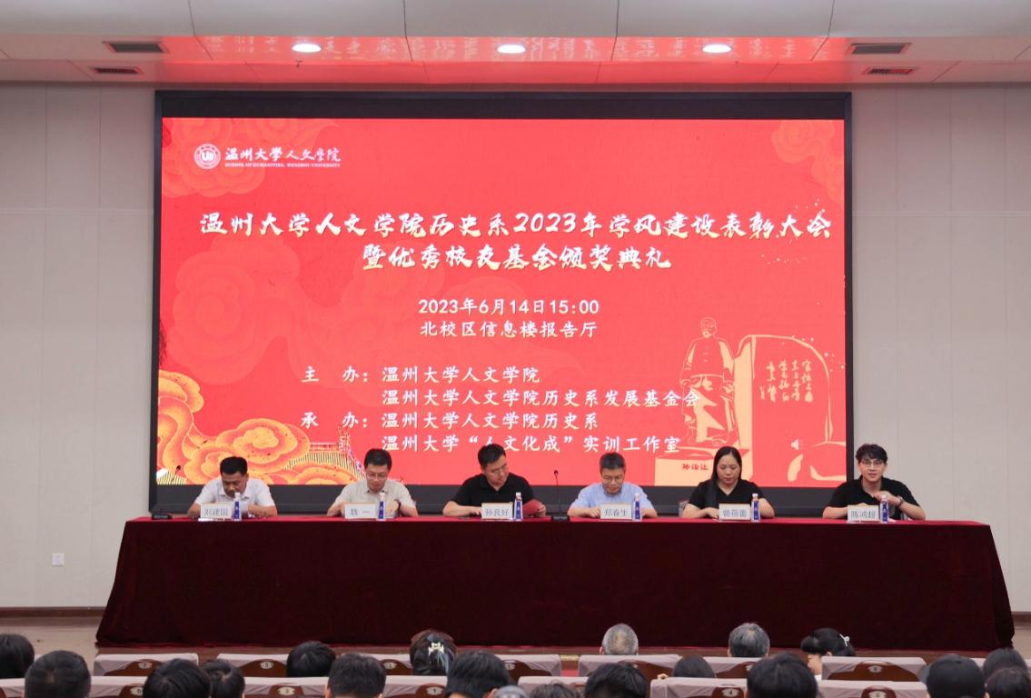 2023年6月14日,球探体育 历史系2023年学风建设表彰大会暨优秀校友基金颁奖典礼于北校区信息楼报告厅举行。大会由球探体育 历史系发展基金会会长刘建国主持,球探体育 院长孙良好、副院长郑春生、院党委副书记魏一、历史系主任陈鸿超、00级历史本科校友、温州大学电气与电子工程学院党委副书记兼纪委书记曾蓓蕾、历史系教师代表、学院辅导员以及历史系全体学生出席。