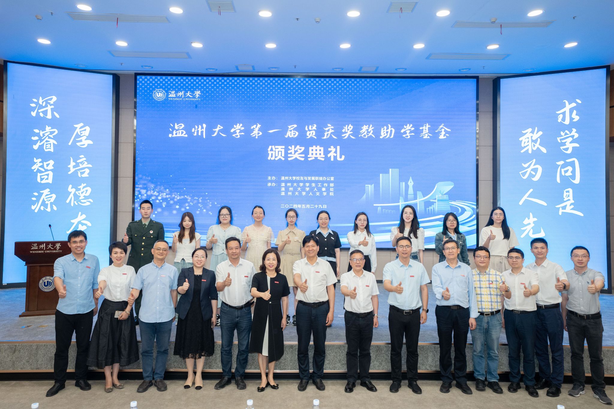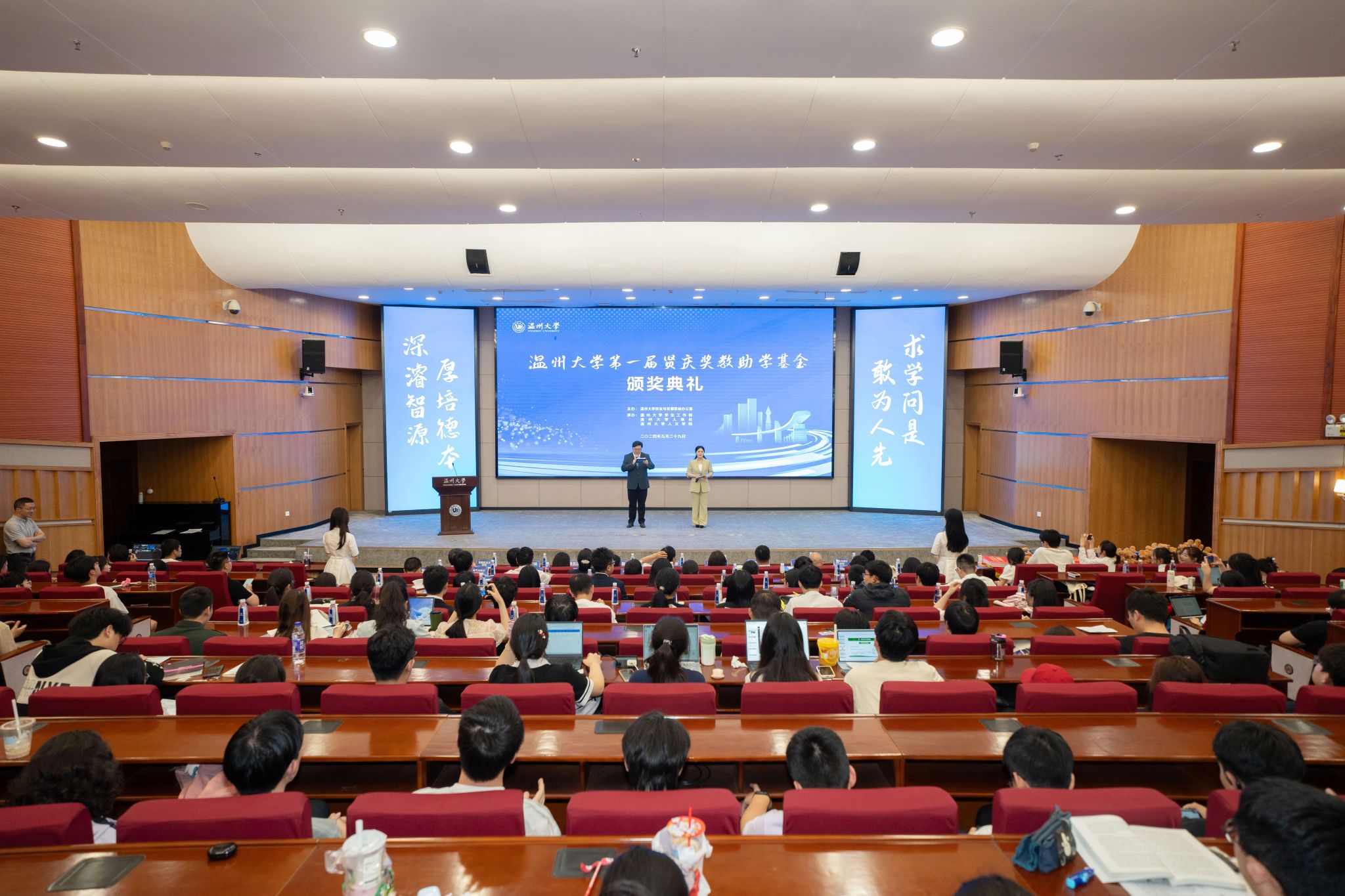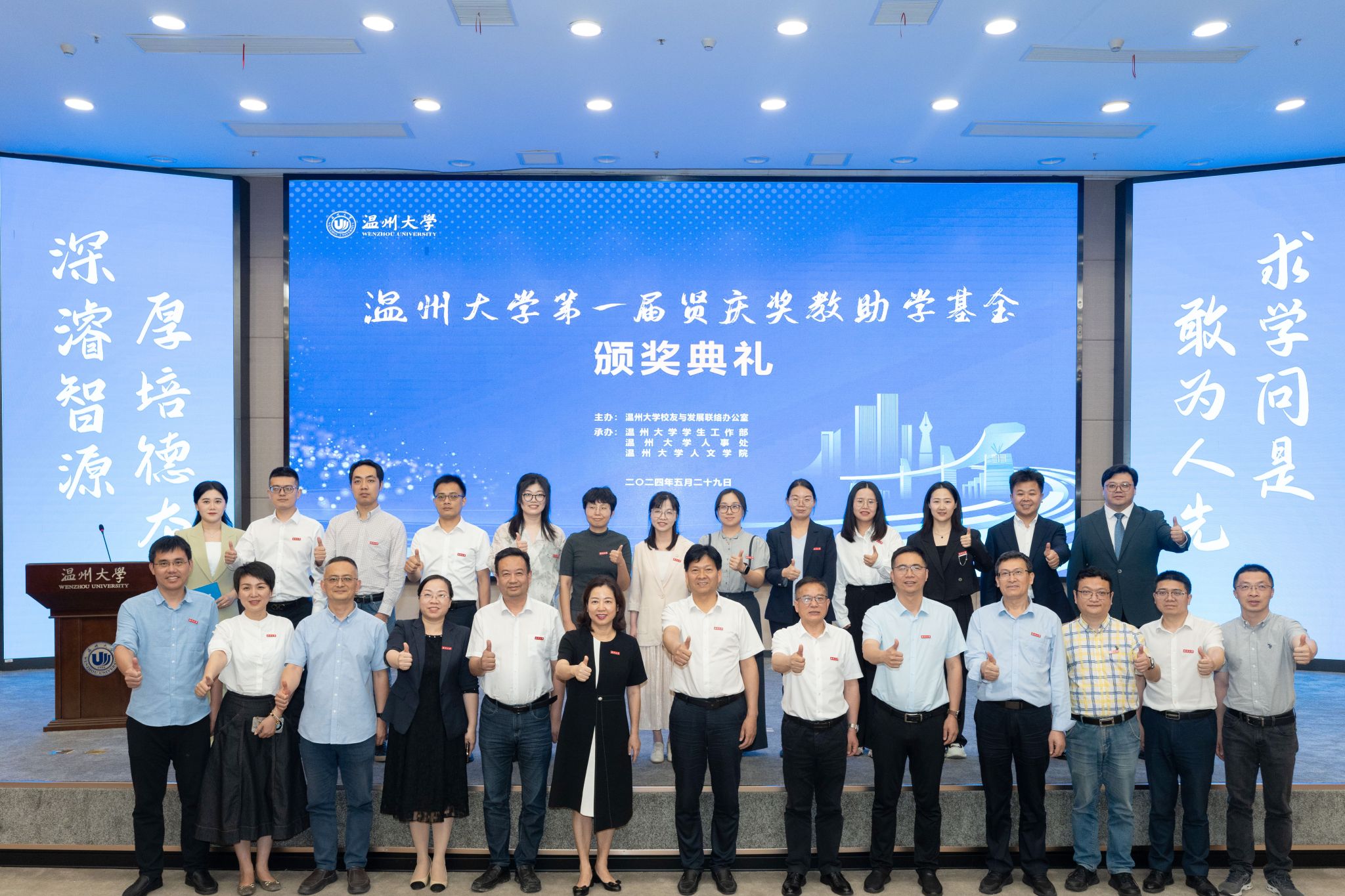 为激励我校教师持续深耕教学科研,鼓励在校学生勤奋学习,5月29日下午,温州大学第一届贤庆奖教助学基金颁奖典礼在育英图书馆二楼报告厅隆重举行,该基金由我校1981届中文专业校友黄纪云先生捐资设立,用于奖励资助学校青年新锐教师和品学兼优学生。校党委副书记庄兴忠、各相关职能部门负责人、各相关学院负责人、获奖师生、师生代表参加典礼。