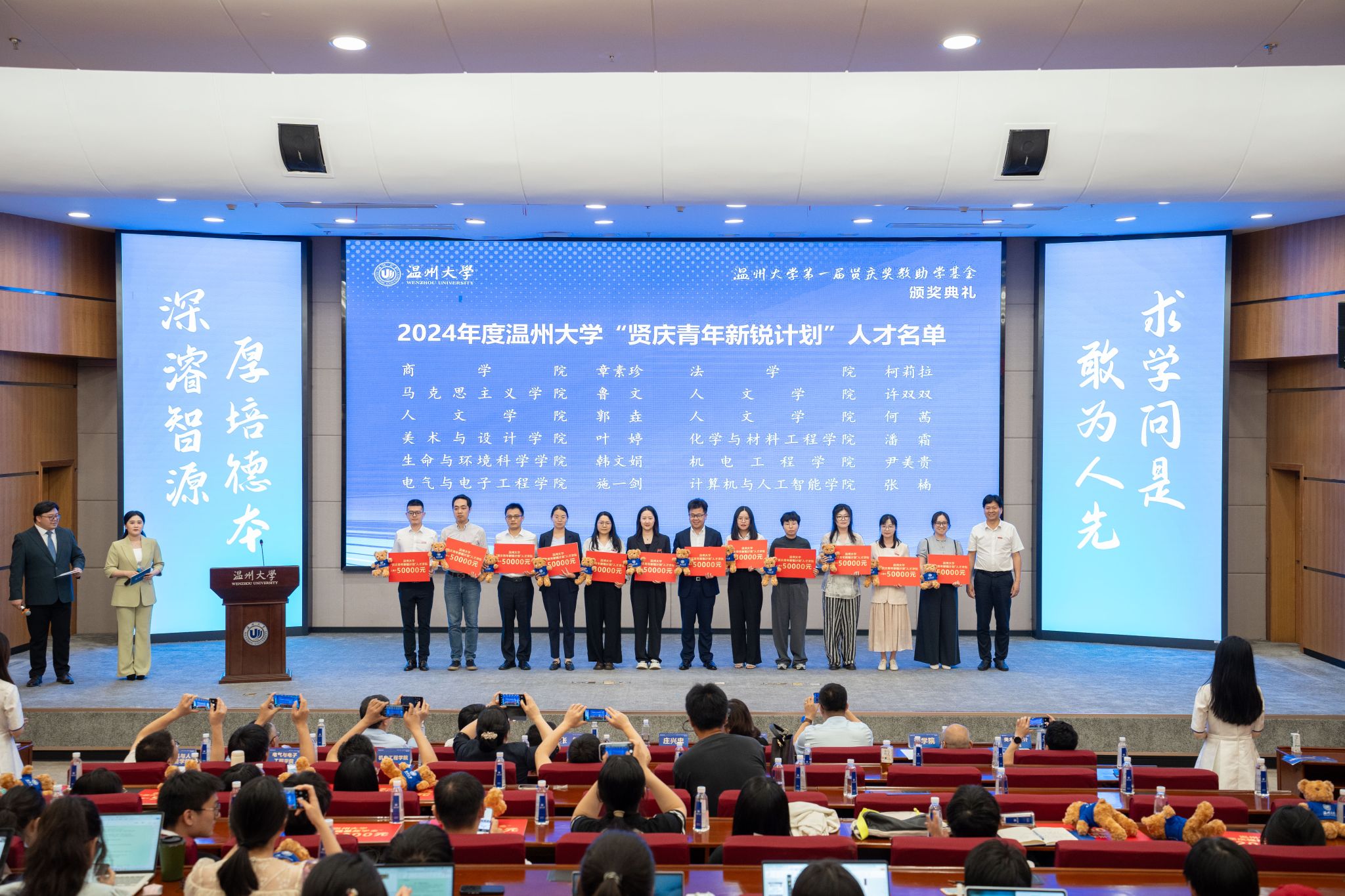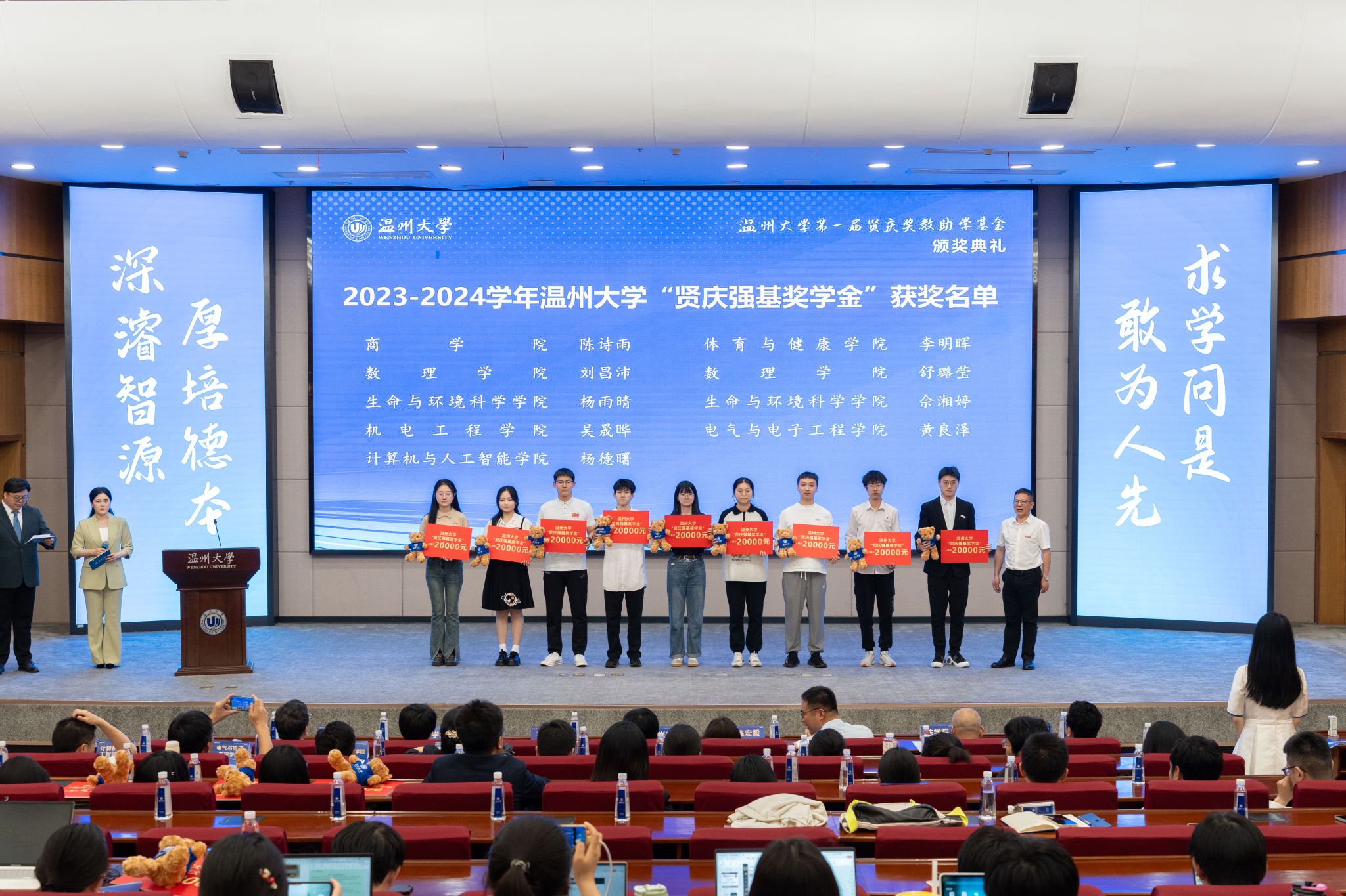 典礼中,领导嘉宾为第一届“温州大学贤庆青年新锐计划”、“温州大学贤庆强基奖学金”、“球探体育 贤庆十佳大学生”的获奖师生颁奖。