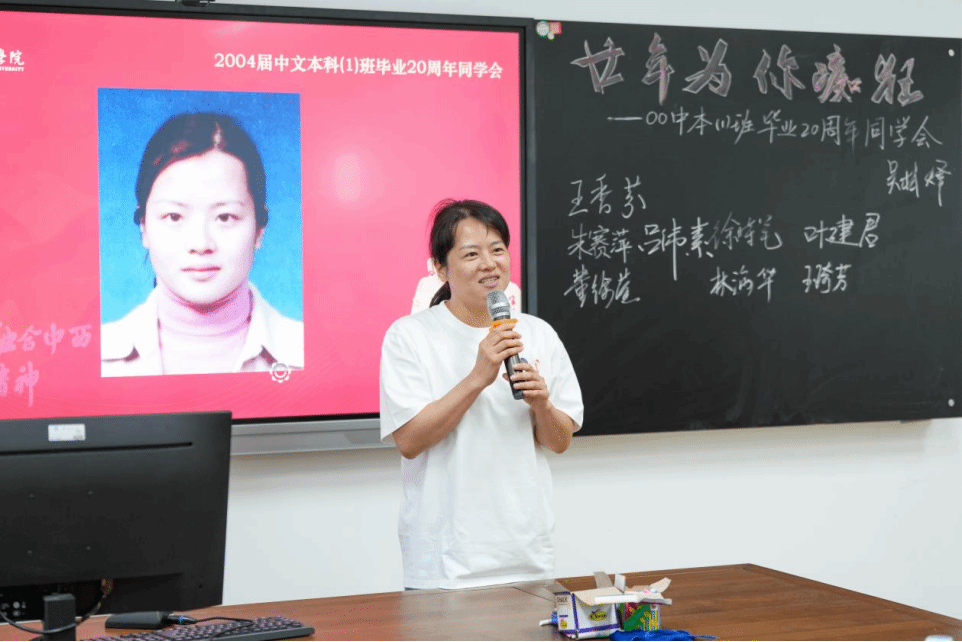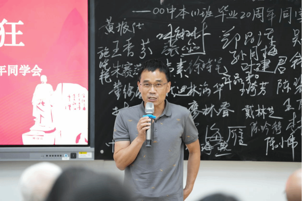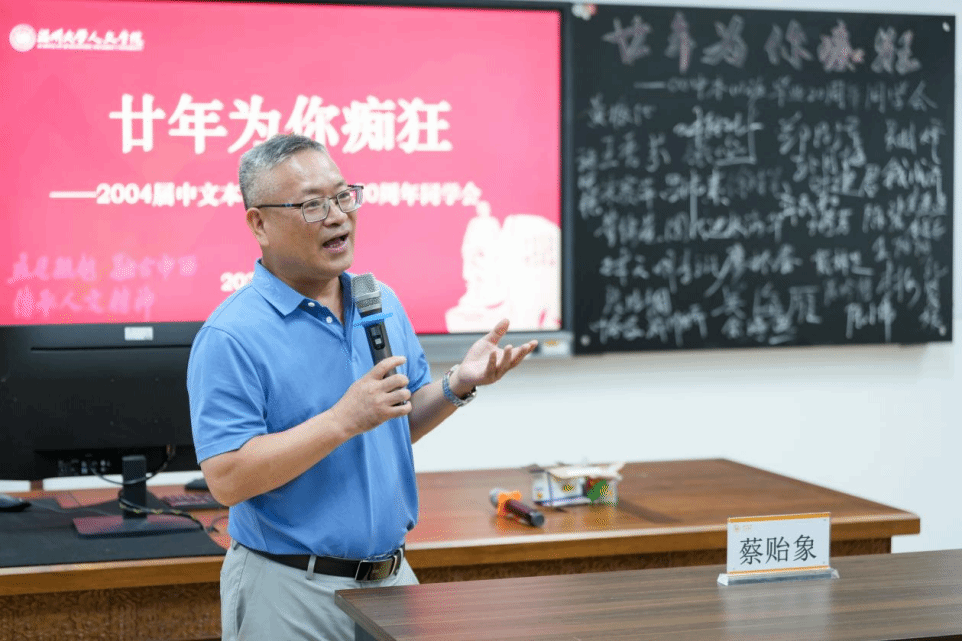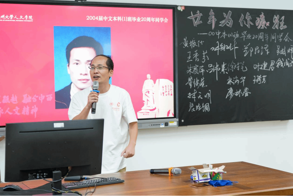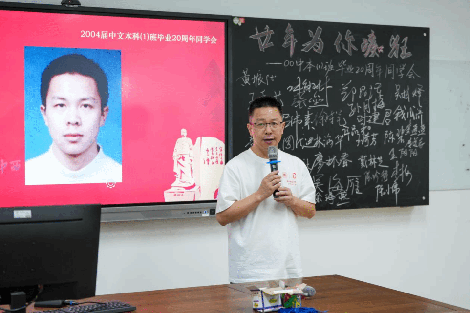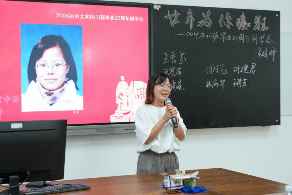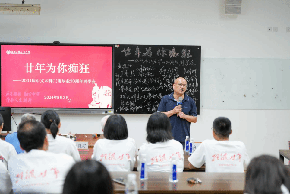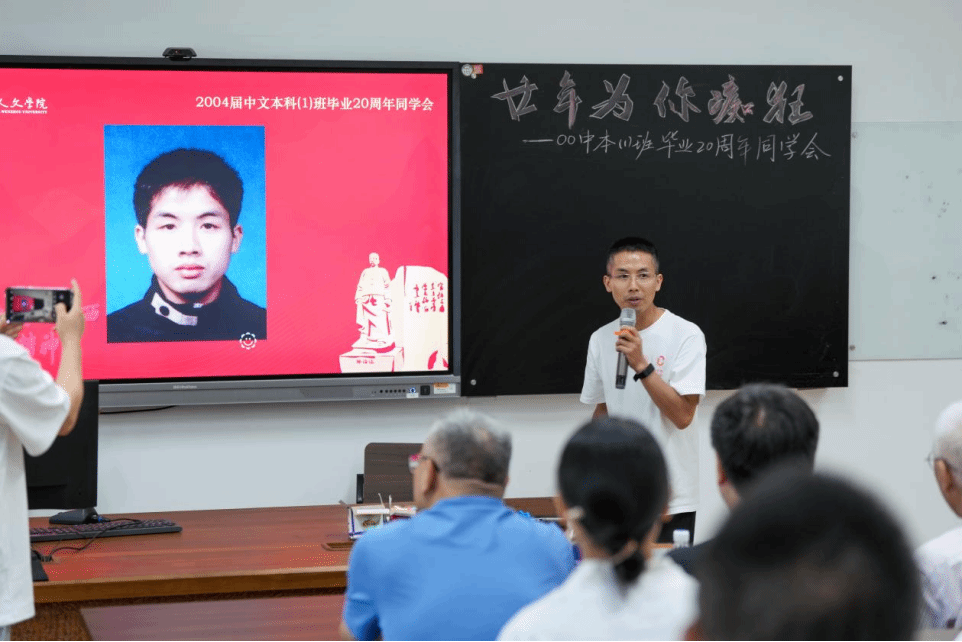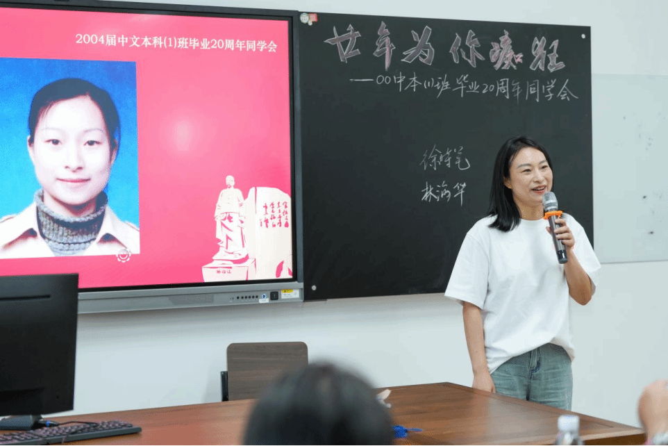 主题班会精心设置了重温课堂环节,骆锤炼老师为同学们献上了饱含深情的《当时我们选择了这座城市》;俞磊老师分享了自己多年的写作教学体会与经验;金理新老师殷殷叮嘱大家要注重阶段和过程;蔡贻象老师从同学们身着的文化衫上的标语“狂飚廿年”切入,结合影视,为大家呈现了这20年的变与不变;林维民老师的诗歌课堂,深入浅出,看似刻板的经典名篇在他口中又生动鲜活了起来,同学们不约而同高诵《关雎》。书声朗朗,笑语晏晏,二十年后重温老师的课堂,那些青葱岁月的读书时光,不禁在大家的脑海里一一浮现。