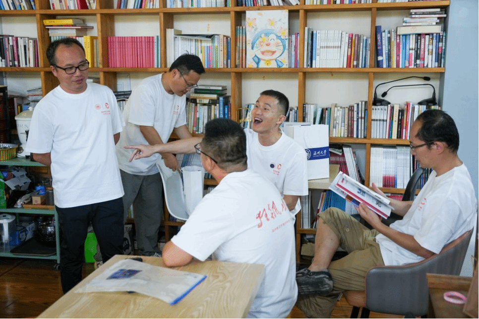 球探体育 院长孙良好,国家语言文字推广基地(温州大学)副主任骆锤炼,球探体育 教师俞磊、金理新、蔡贻象、林维民与各位校友一起,游故地、聊过往、写寄语、拍合影,追忆四载校园事,闲叙廿年思念情。