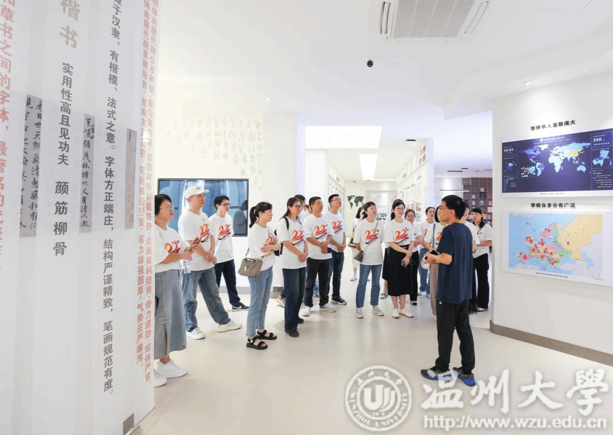 校友们共同前往国家语言文字推广基地(温州大学),基地副主任骆锤炼老师向校友们介绍了基地近年来的一些重要科研成果以及文字推广工作。大家不仅对语言文字推广工作的重要性与开展方式有了更深刻的认知,也感受到了学院建设的日新月异。