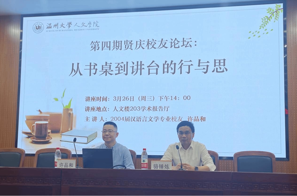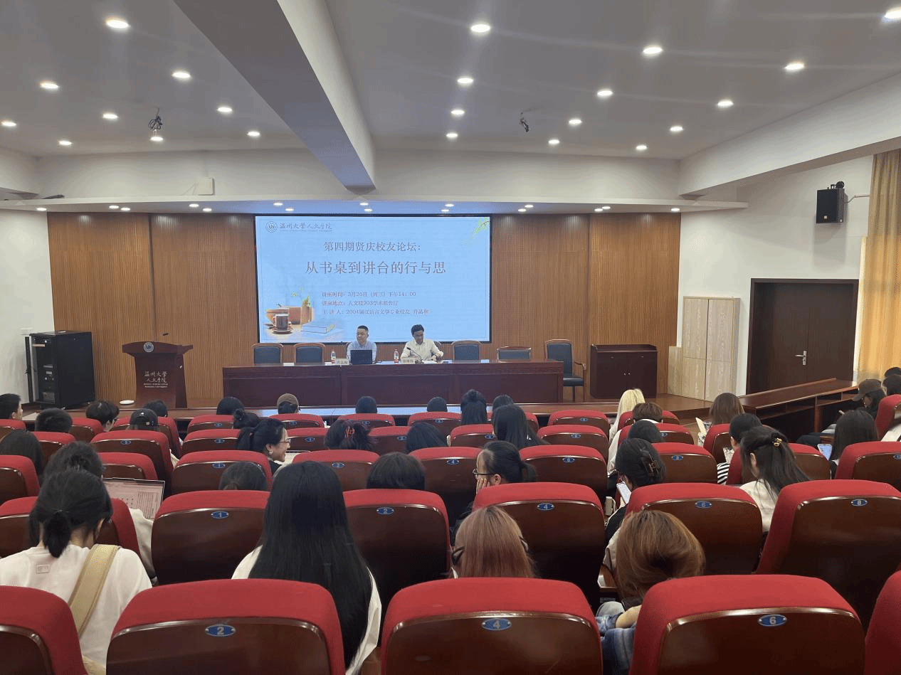 2025年3月26日下午,2004届汉语言文学专业校友许品和在人文楼203学术报告厅为球探体育 学生带来了“从书桌到讲台的行与思”主题讲座。本次讲座由骆锤炼老师主持,100余位学生积极参与。