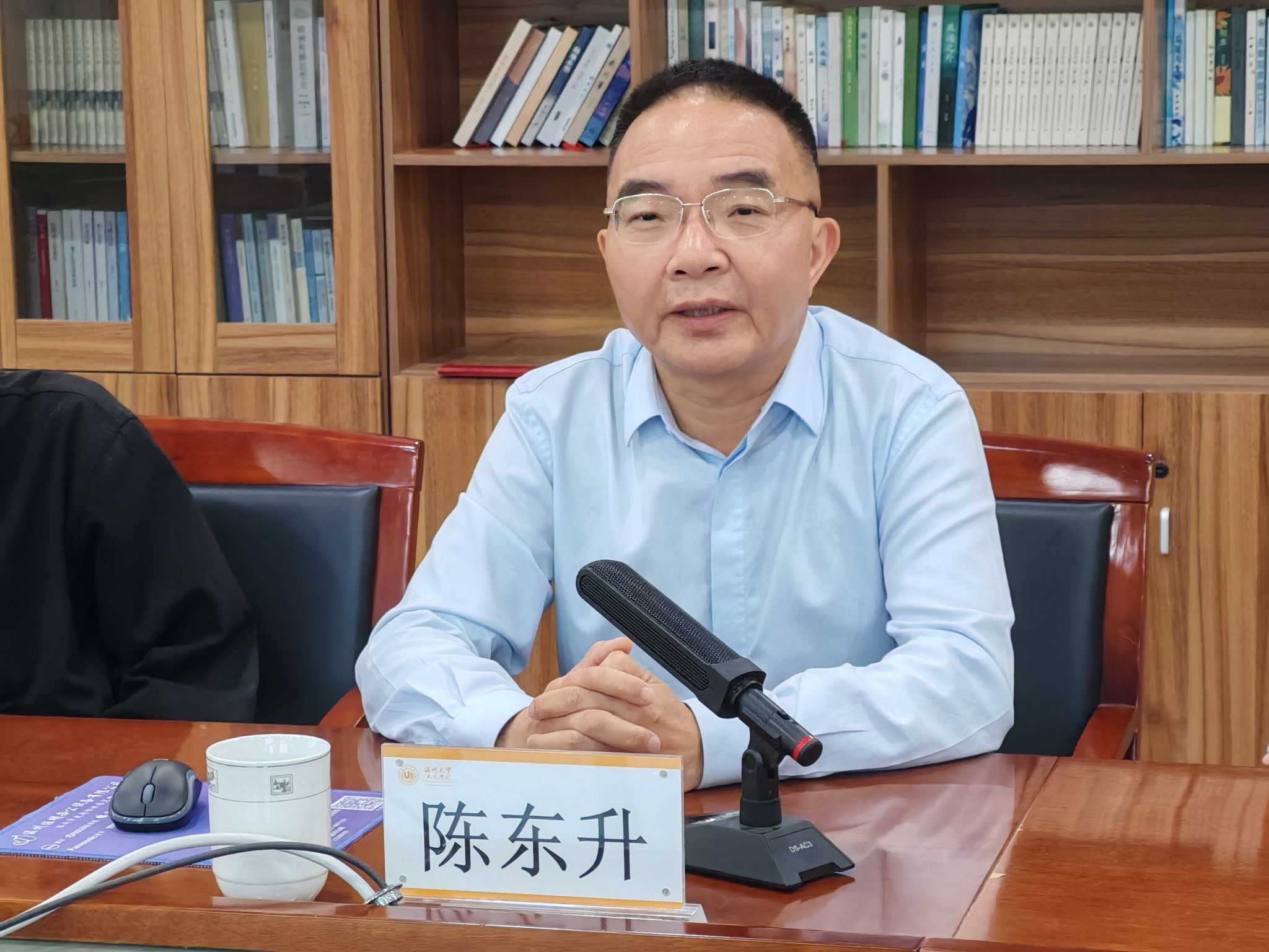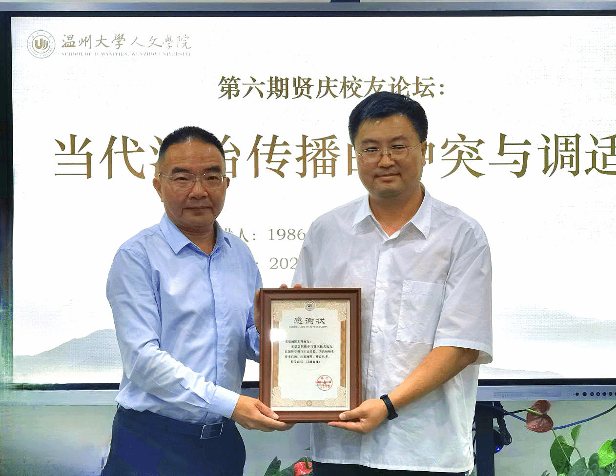 主题分享结束后,三位与谈嘉宾张龙、包登峰、何田田三人先后从市场化媒体环境与文学创作、党政法治宣传实践、媒体人的职业精神分别分享各自的感悟与见解。本院院长孙良好教授对本次讲座进行总结,并代表学院向校友陈东升教授赠送“贤庆校友论坛”感谢状。