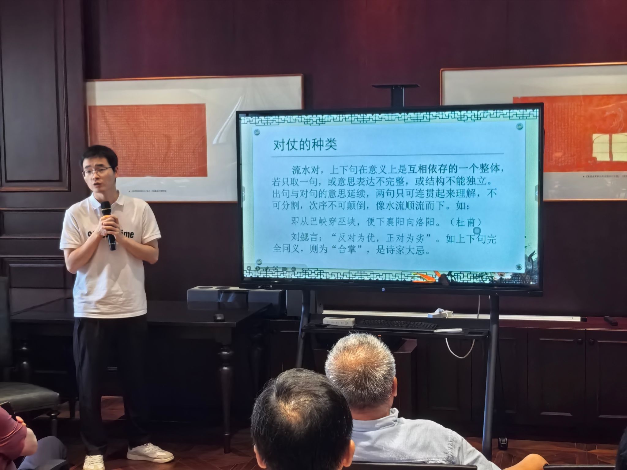 本次活动还特邀了温州大学球探体育 讲师王朋飞作《对仗知识与技巧》专题讲座。王老师从对仗的源流、词类、种类及避忌等方面展开讲解,结合实例提出在诗词楹联创作中如何追求工整严谨、加强语法逻辑等建议,让校友们受益匪浅。