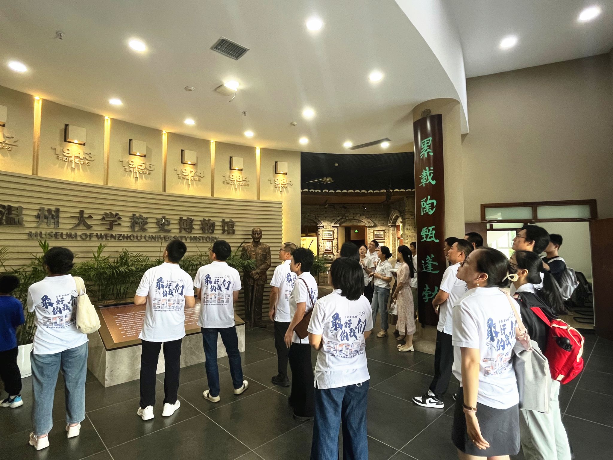 在温州大学校史馆的时光长廊里,校友们驻足流连。从泛黄的影像和熟悉的场景中,依稀可见当年校友们与校园的模样,往昔的求学岁月历历在目。校友们与当年的毕业合影进行了一次“穿越时空”的创意同框,大家既感慨岁月流转,也为母校今日的发展倍感自豪。
