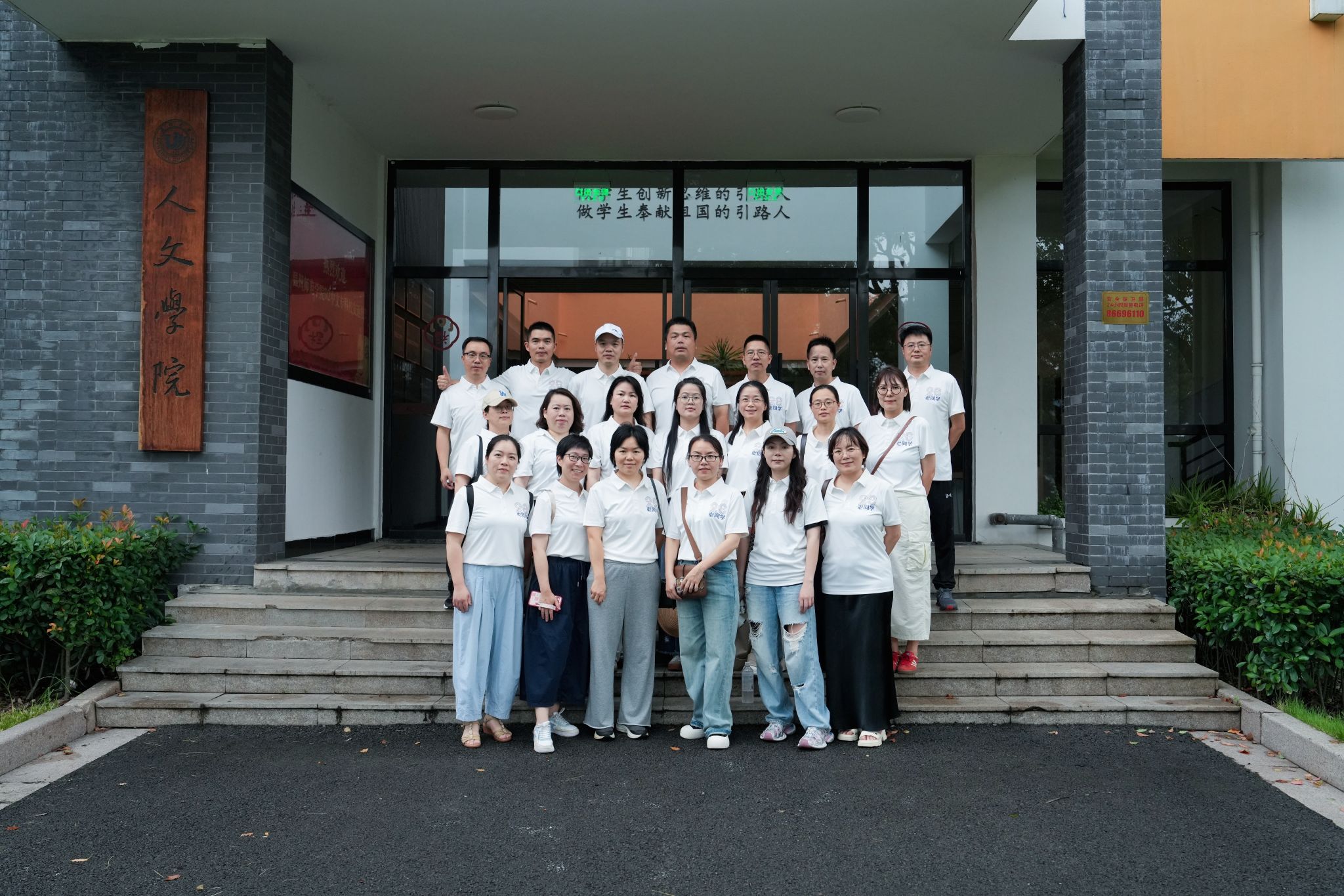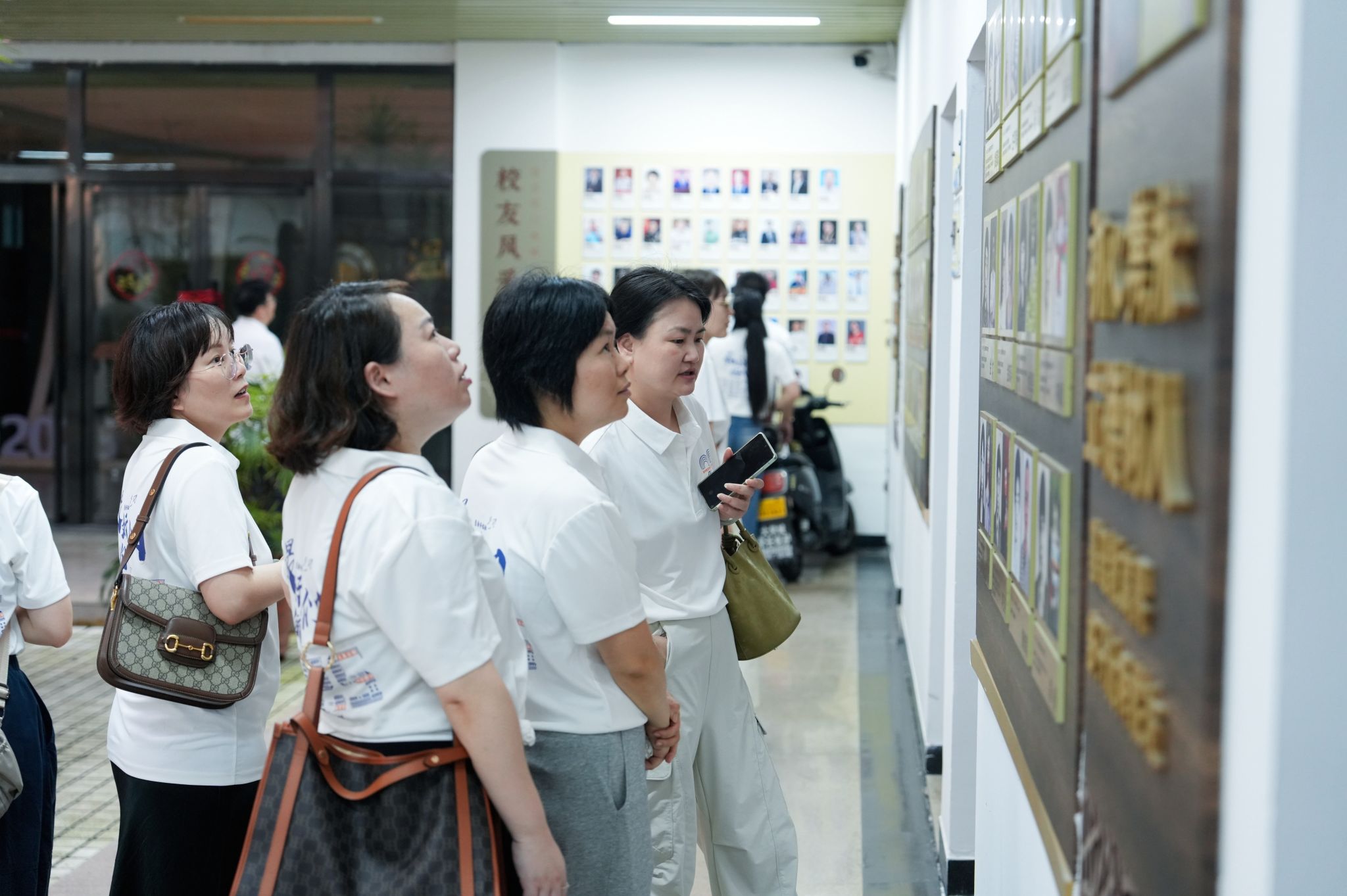 在人文楼门前,校友们愉快地拍摄了集体合影。走进人文楼内,大家在校友风采展示墙前寻找自己和同窗当年的照片;在学院教师墙前找寻当年授课老师的照片,唤起了许多关于课堂和师长的珍贵记忆,仿佛昨日重现。现场充满欢声笑语。