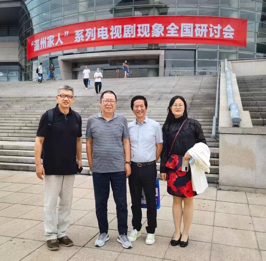 △2021年6月11日“温州家人系列”电视剧研讨会召开,陈振洲、编剧高满堂、编剧李涛、黄碧红合影(从左至右)