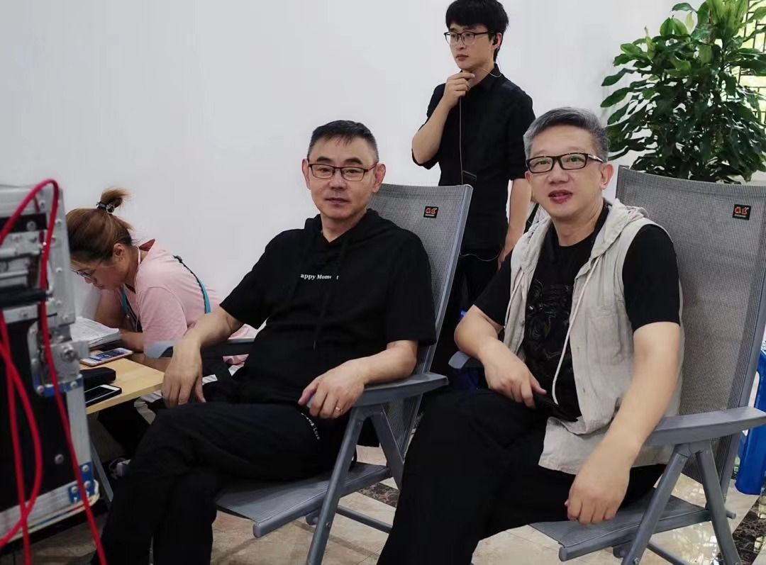 △陈振洲(右) 和《温州三家人》导演苏舟在拍摄片场