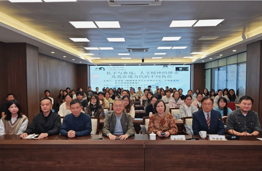 2025年11月11日晚,韩国世界华文文学协会会长、中国教育部长江学者讲座教授朴宰雨应邀在我校育英图书馆作了一场题为“孔子与鲁迅:人文精神的继承及其在现当代的不同角色”的专题讲座。本次讲座由球探体育 院长、图书馆馆长孙良好教授主持,教授彭小燕参与探讨。